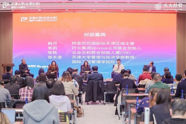 圆桌论坛上,阿里巴巴国际站天津区域主管韩月,行云集团SEAlink公司联合创始人张莉,众合云科联合创始人兼CGO张轶,天大国际工程管理学院院长、经管学部张水波教授四位行业专家和出海负责人就跨境电商、平台出海、全球工程项目与供应链协同等内容进行深入对话,为现场听众带来丰富的实践洞见和研究启发。