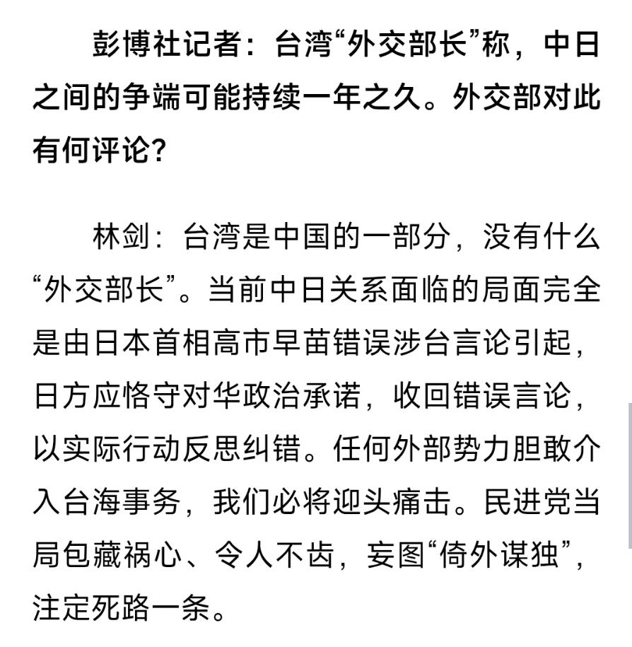 12月2日外交部例行记者会上的一幕。 🇺🇸彭博社记者:台湾“外交部长”称,中日之间的争端可能持续一年之久。外交部对此有何评论? "台湾是中国的一部分,何来'外交部长'?"林剑的声音像冰锥刺破空气,"这个头衔本身,就是民进党当局伪造的政治泡沫。"他身后的蓝底国徽纹丝不动,映着台下外媒镜头的反光。 彭博社记者显然没料到开场白就被定性,笔记本上的录音笔突然发出轻微的电流杂音。 时间倒回两周前,日本首相高市早苗在国会将"台湾有事"与日本"存亡危机"挂钩的言论,此刻正在外交部的发言稿里灼出焦痕。 林剑的视线扫过面前的提词卡,那里密密麻麻记着《中日联合声明》的条文——1972年那份文件里,日方明明承诺"充分理解和尊重中国政府关于台湾是中国不可分割一部分的立场"。 "现在日方却说'一贯立场'语焉不详?"他的语气突然加重,"那就让历史说话:从1972年到2008年,中日四个政治文件,哪一份没白纸黑字写着台湾属于中国?" 台下朝日电视台记者下意识摸向录音设备,想起三天前日本经团联秘密递交给中方的访华申请。 此刻林剑正谈到日本国内的"有识之士",他们的担忧变成了外交部的论据:"当日本防卫费连续十三年增长,当'对敌基地攻击能力'被写进防卫大纲,当二战战败国的首相用'存亡危机'威胁战胜国——这就是日方所谓的'专守防卫'? "他突然翻开联合国宪章复印件,泛黄的纸页在灯光下泛着冷光,"第一章第二条第四款,清清楚楚写着禁止使用武力威胁。高市首相的发言,本质是对《开罗宣言》《波茨坦公告》的公然践踏。" 坐在第三排的路透社记者注意到,林剑提到"80年前的胜利"时,喉结动了动。 2025年是抗战胜利80周年,钓鱼岛海域的巡航记录显示,仅上个月中国海警就驱离日方船只17次。"就在昨天,日本'瑞宝丸'号渔船再次闯入钓鱼岛领海。"他的声音突然低沉,"有些人忘了,1945年的投降书不是装饰品。" 话题回到台湾,彭博社记者的提问像根导火索,林剑的手指敲了敲桌面:"民进党当局的'外交部长'敢预测中日争端?他们连自己的身份都不敢承认。" 他身后的电子屏突然切换,显示着2023年中洪建交时的联合公报——洪都拉斯正是在一个中国原则下与台湾"断交"。"看看洪都拉斯的例子,任何'倚外谋独'的行径,最终都是竹篮打水。" 会场后排,今日俄罗斯记者举起了手,但林剑的话还在继续:"日方现在说要沟通,经团联要访华。" 他翻开日方团体的请愿信复印件,"但前提是日方撤回错误言论。去年中日贸易额3.5万亿人民币,不是靠嘴皮子换来的。" 说到这里,他突然看向朝日电视台记者,"贵国企业家难道不明白?当政客在台湾问题上玩火,最先受损的是两国产业链。" 时钟指向17:50,记者会接近尾声,林剑整理发言稿的动作突然停顿:"最后说给某些人听。"他的目光扫过全场,"台海局势的根源,是民进党当局拒不承认'九二共识'。任何外部势力介入,都只会让局势更糟。" 窗外的暮色渐浓,他的声音却愈发清晰,"中国维护主权的决心,不是恐吓,是14亿人的底线。80年前我们能赢,今天更不会退后半步。"