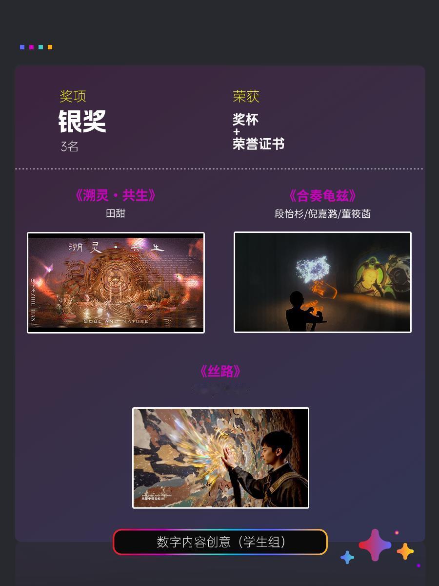 🎊 第四届 “光年奖” 数字创意大赛圆满落幕! 全球创意达人集结,215 件投稿作品尽显脑洞与实力,经过多轮激烈角逐,32 件佳作强势突围,成功摘得荣誉桂冠🏅! 五大赛道全面覆盖数字创意热门领域,CAVE 赛道更是诚意升级,10 万高额奖金点燃创作激情,吸引无数优质作品踊跃参与🔥! 23 位来自企业、院校的行业权威组成专业评审团,以严苛标准筛选精品,为赛事含金量保驾护航! 重点来啦👉 获奖作品即将在官方平台重磅上线,数字创意与跨界融合的精彩碰撞,每一件都值得细细品味! [左上]赶紧关注官方账号,第一时间围观顶尖创意之作,解锁灵感新姿势~ [鼓掌]现在就速速围观 数字内容创意学生组 的获奖作品吧! 光年奖 数字创意巅峰对决 跨界融合新高度