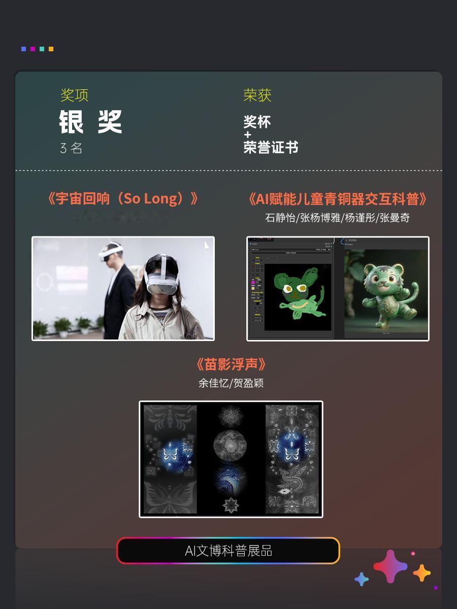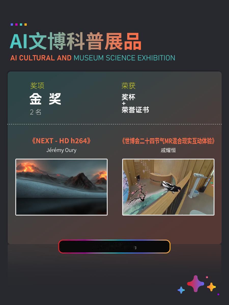 🌟 第四届 “光年奖” 数字创意大赛高光收官! 全球征集 215 件创意力作,跨领域佳作同台竞技,最终 32 件作品凭借硬核实力脱颖而出,荣耀折桂🏅! 五大赛道全面覆盖数字创意前沿领域,CAVE 赛道更是诚意加码,10 万奖金点燃创作热潮🔥! 23 位企业领军者、院校权威专家组成评审天团,专业视角严苛筛选,赛事含金量拉满! 悄悄剧透:获奖作品即将在官方平台集中亮相,解锁数字创意与跨界融合的无限可能~ [左上]速戳关注,第一时间围观顶尖创意盛宴! [给力]快来欣赏 AI文博科普展品的获奖作品吧! 光年奖 数字创意巅峰赛 跨界融合新势力