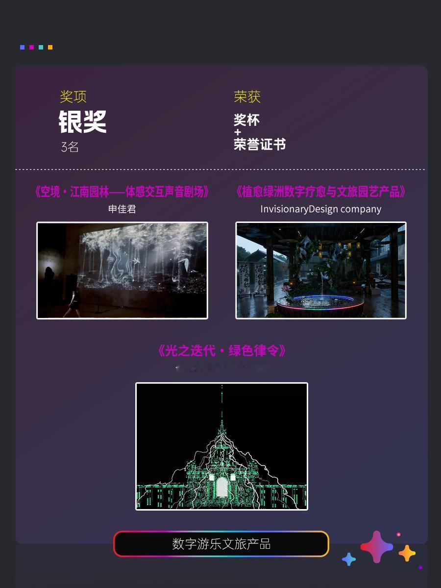 🚀 第四届 “光年奖” 数字创意大赛收官盛典来袭! 全球 215 件创意大作跨界集结,脑洞与实力双向在线,经过层层严苛筛选,32 件顶尖佳作强势突围,斩获荣誉桂冠🏆! 五大赛道全景覆盖数字创意前沿,CAVE 赛道更以 10 万高额奖金重磅加码,点燃全球创作者的创作热情🔥! 23 位企业领袖、院校权威组成超豪华评审团,专业视角精准赋能,为赛事含金量全程背书! 重磅预告:获奖作品即将登陆官方平台开启集中展示,数字创意与跨界融合的火花四溅,每一件都是视觉与思想的双重暴击~ [左上]赶紧锁定官方账号,第一时间解锁创意巅峰之作! [鼓掌]现在就来看看数字游乐文旅产品赛道的获奖作品吧! 光年奖 数字创意盛宴 跨界破界