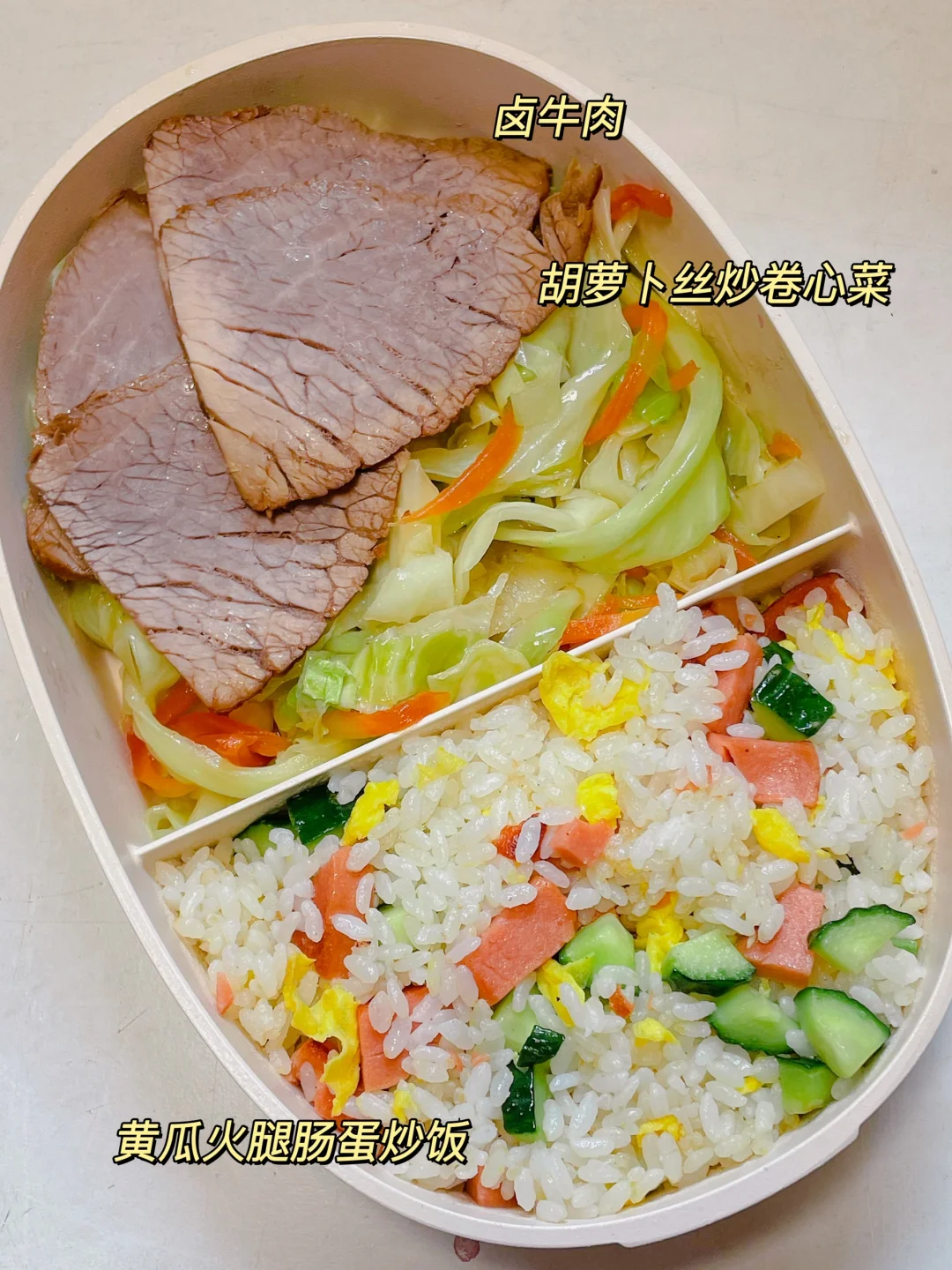📍黄瓜火腿肠蛋炒饭+胡萝卜炒卷心菜+卤牛肉