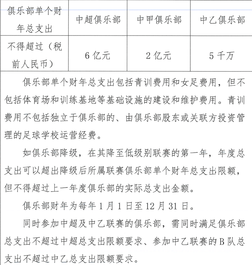 根据规定,中超俱乐部每年最多支出不得超过6亿元,中甲俱乐部最多支出不得超过2亿元,中乙俱乐部每年最多支持不得超过5千万元。