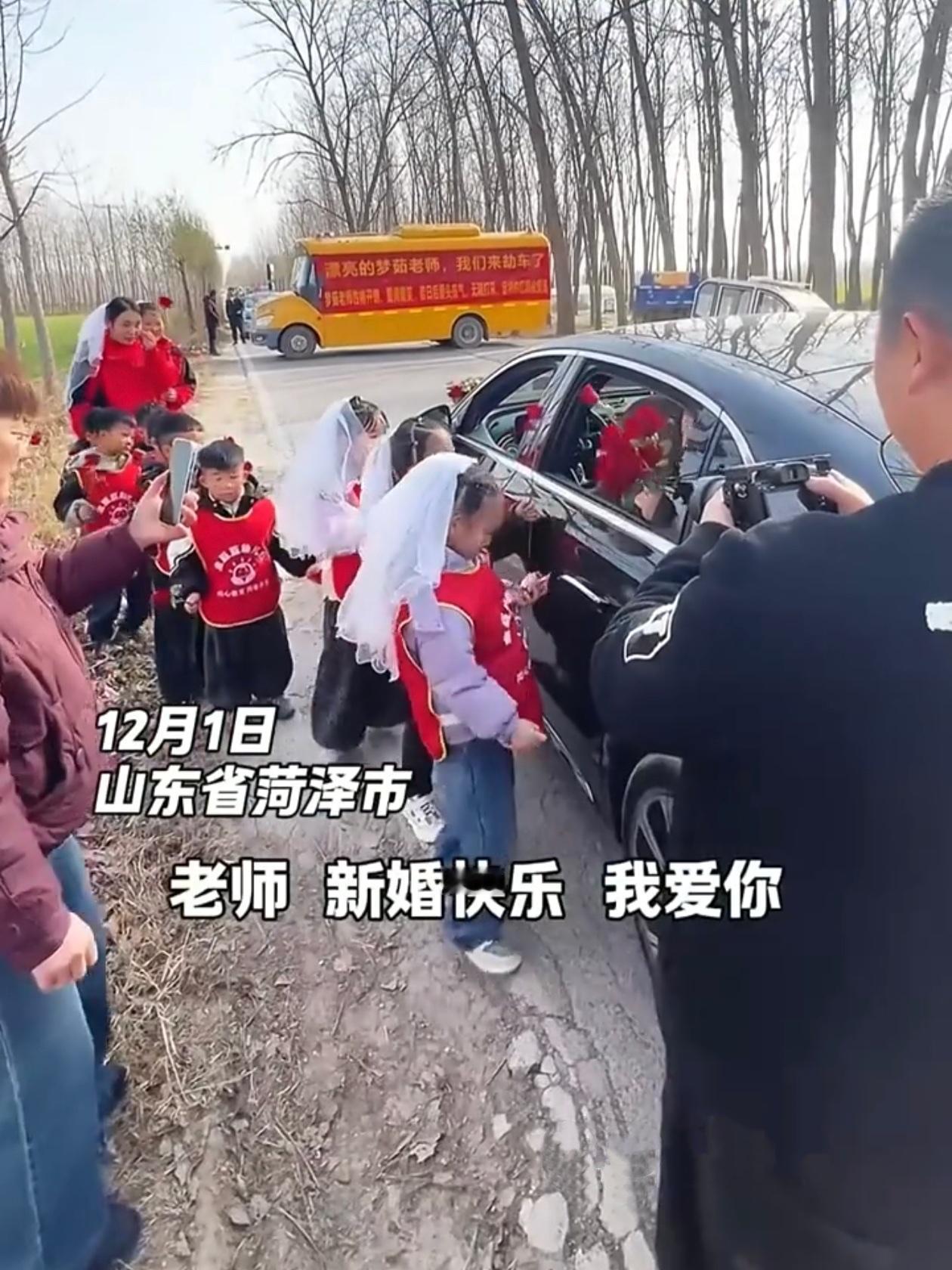 山东一幼师结婚那天,婚车开到半路被自己班上的孩子们拦下了,小家伙们手里拿着玫瑰花