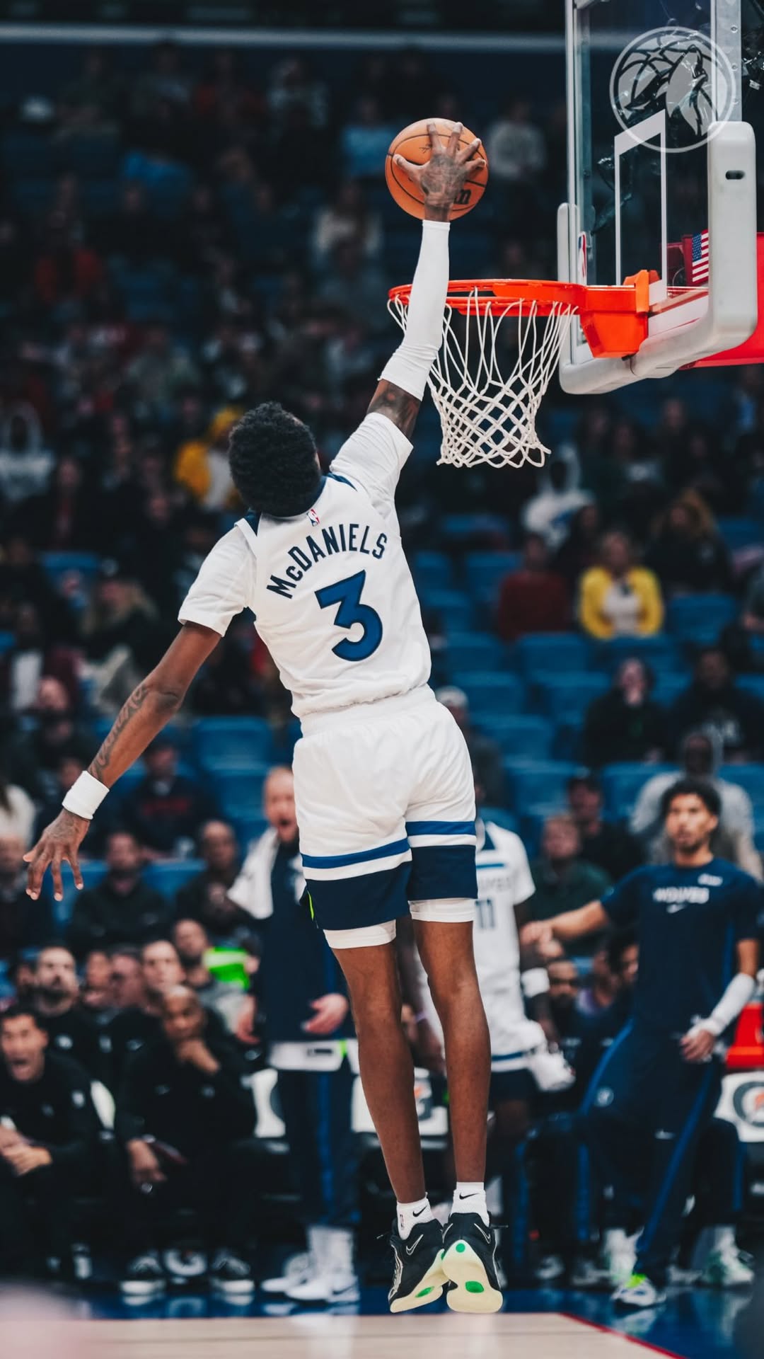 虎扑12月03日讯森林狼官方更新社媒,晒杰登-麦克丹尼尔斯赛场扣篮瞬间。
