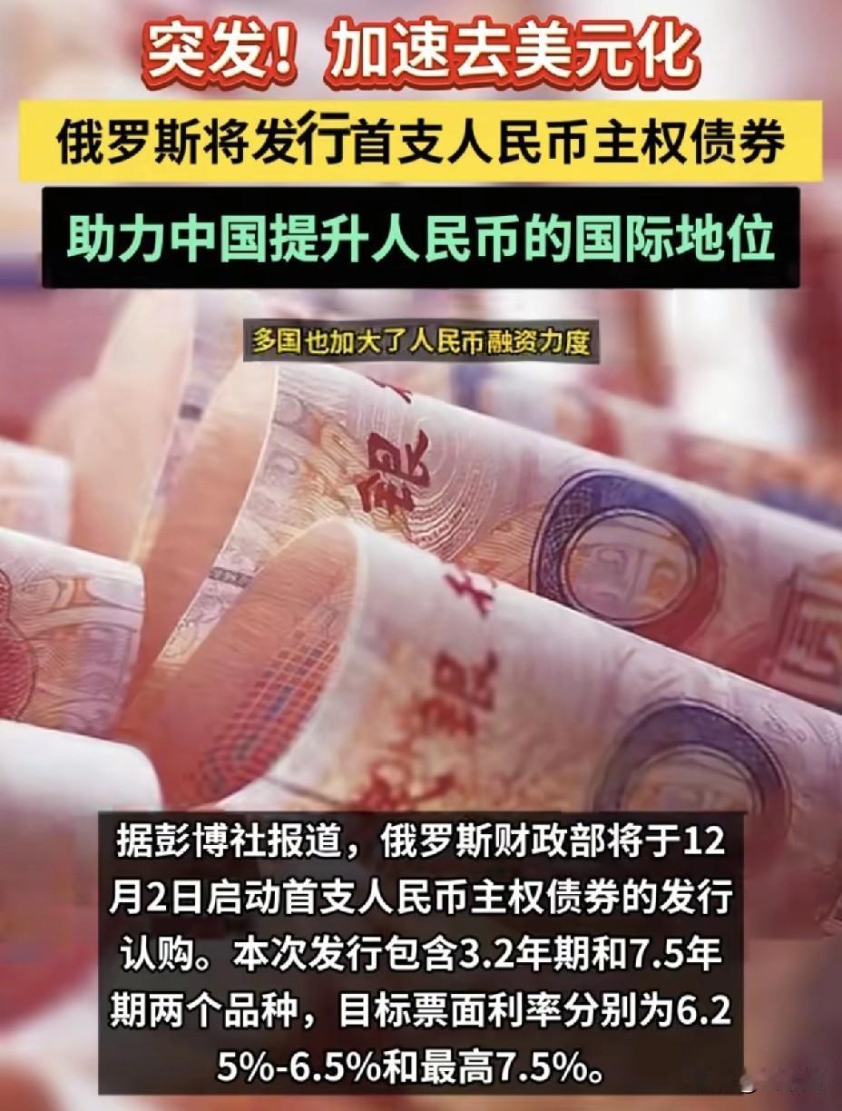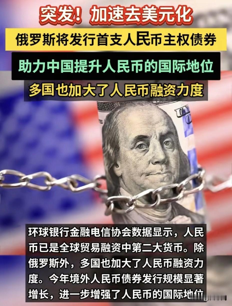 俄罗斯发行人民币债券引爆全球? 历史性转折震动华尔街! 莫斯科传来爆炸性消息 俄罗斯宣布首次发行人民币主权债 这是世界金融史上头一遭 美元霸权遭遇致命一击 三大内幕震撼曝光: 1️⃣ 人民币攻入西方金融禁地 俄罗斯主权债首次用人民币计价 3-8年期利率高达6.25%-7.5% 国际资本疯狂抢购 2️⃣ 中俄联手改写金融规则 用被制裁的卢布买人民币债券 打造完全独立于美元的支付闭环 华尔街分析师大呼“游戏规则变了” 3️⃣ 全球去美元化加速 今年已有匈牙利、印尼等国跟进 人民币国际债券发行创纪录 美元储备地位开始动摇 看看这场金融革命多震撼: ✅俄罗斯财政赤字找到新出路 ✅数万亿人民币在俄找到投资渠道 ✅为中国企业打开俄基建市场 最让美国恐慌的是: 这是第一个G20资源大国 用人民币发行主权级债务 示范效应将引发雪崩 专家震撼评价: “这是布雷顿森林体系以来 全球货币格局最大变局 单极金融时代彻底终结” 网友沸腾: “支持人民币国际化!” “中国金融崛起势不可挡” 最新战报: 离岸人民币汇率应声走强 多国央行紧急研讨方案 美元指数出现剧烈波动 这场金融博弈刚开场, 点赞看人民币如何破局? 关注看美元霸权如何崩塌! 评论看你支持人民币取代美元吗?