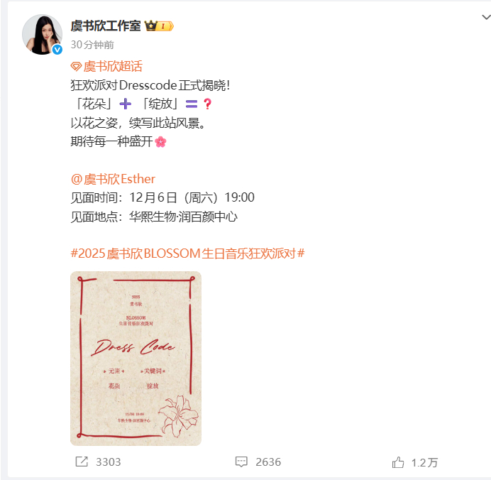 生日音乐狂欢派对的 Dresscode 关键词公布,虞书欣选择花朵和绽放为核心,