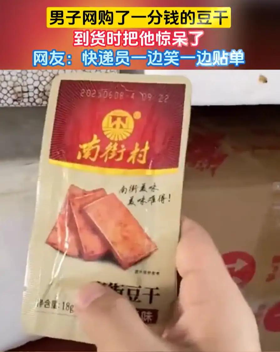 河南,男子花1分钱网购了一份豆干,本以为是捡漏,可快递送到后,他在驿站左找右找也