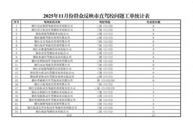 烟台市交通运输执法监察支队将2025年11月份芝罘区、莱山区、高新区23所驾校的投诉排名情况予以公布。