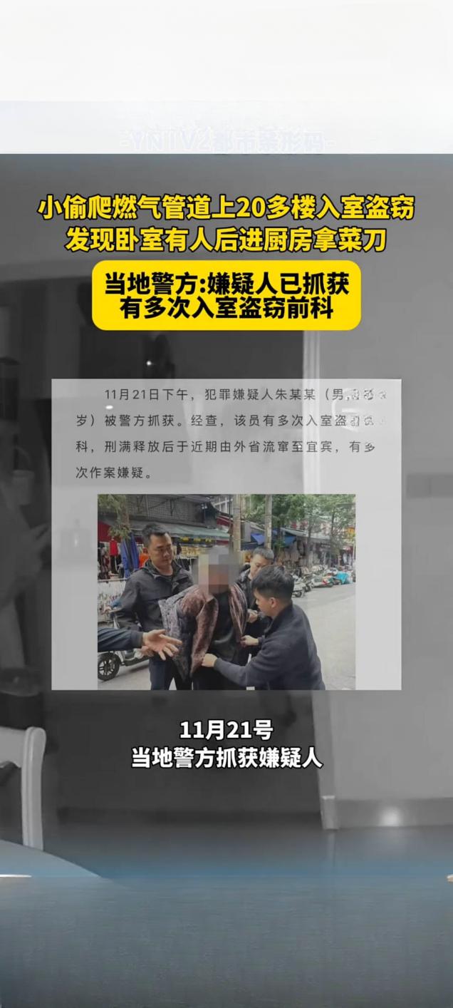 男子攀爬燃气管道上20楼行窃 持刀惊魂终落网 近日,一桩通过攀爬燃气管道登上20多层高楼实施入室盗窃的案件引发社会关注。监控画面显示,犯罪嫌疑人通过大楼外立面的燃气管道徒手攀爬至高层,在进入住户家中行窃时,意外发现卧室有人,竟转身进入厨房拿起菜刀,场面一度十分危急。 据当地警方通报,该嫌疑人目前已被成功抓获。经调查,此人曾有多次入室盗窃前科,是个惯犯。这段记录案发过程的视频在快手平台已获得超过4600次播放,引发网友对高层住宅安全的广泛讨论。 这起案件暴露出两个令人担忧的问题:一是高层住宅并非盗窃分子的禁区,通过攀爬管道等原始手段仍可进入;二是嫌疑人从盗窃到持刀的行为升级,显示出极大的社会危害性。所幸此次事件中未造成人员伤亡,但已足够敲响警钟。 警方提醒市民,居住在高层楼房的居民也应做好基本防盗措施,建议安装防盗窗、监控报警器等安防设备。同时,物业管理方也需加强对楼体外立面的日常巡查,消除安全隐患。目前,案件正在进一步审理中。入室盗贼 小区盗窃入室抢劫案 小伙盗窃 居民安全