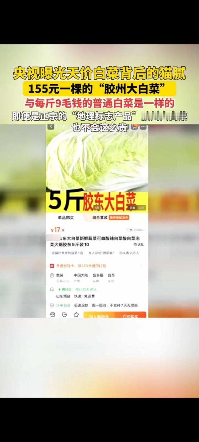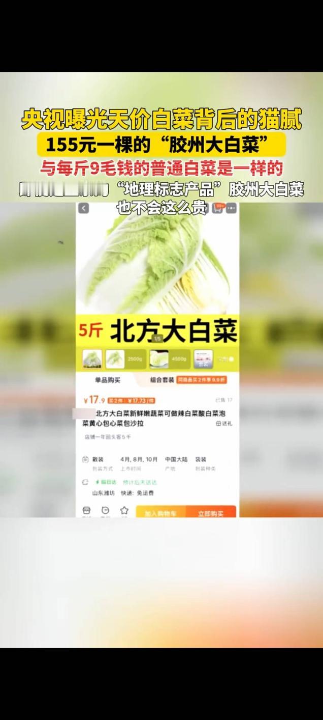 央视曝光“天价白菜”乱象 “胶州大白菜”竟与普通白菜无异 近日,央视一则调查报道引发社会广泛关注:市场上售价高达155元一棵的“胶州大白菜”,经专业检测发现其品质与每斤仅售0.9元的普通白菜并无差异。该报道在快手平台获得1.2万次播放,消费者直呼“上当”。 报道揭露,部分商家利用“地理标志产品”概念进行包装营销,将普通白菜冠以“胶州大白菜”之名,通过精美礼盒、虚假宣传等手段抬高价格,制造“高端农产品”假象。实际上,这些所谓“特供白菜”在营养成分、口感等方面与市售普通白菜基本一致,存在严重价格虚高问题。 此类“挂羊头卖狗肉”的行为不仅侵害消费者权益,更扰乱了农产品市场秩序。业内人士指出,农产品品牌化本是助农增收的有效途径,但若缺乏严格监管和标准认证,反而会成为不良商家的牟利工具。 目前,相关部门已介入调查。专家呼吁应完善地理标志产品认证体系,建立从产地到销售的全程可追溯机制,同时加强市场监管,让真正优质的农产品物有所值,让消费欺诈无处遁形。原生态大白菜 黑心白菜 山东白菜 欺诈消费者