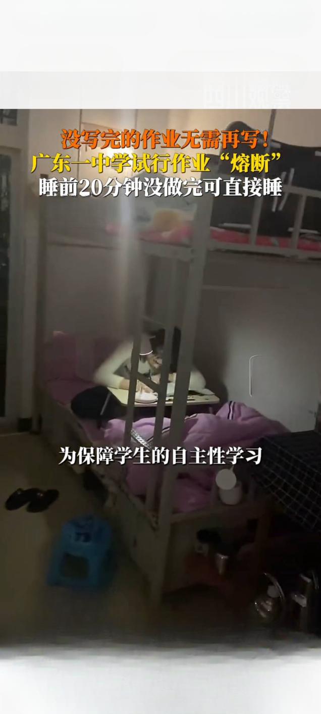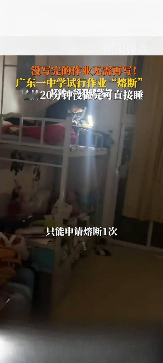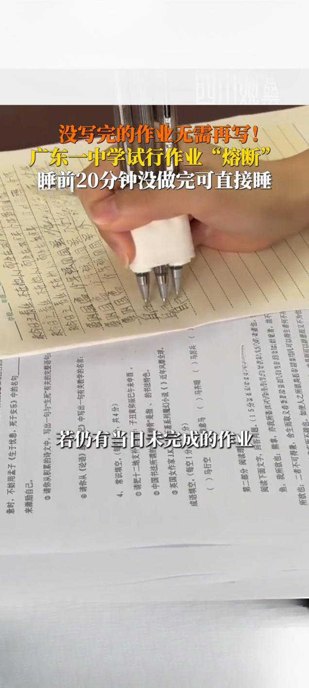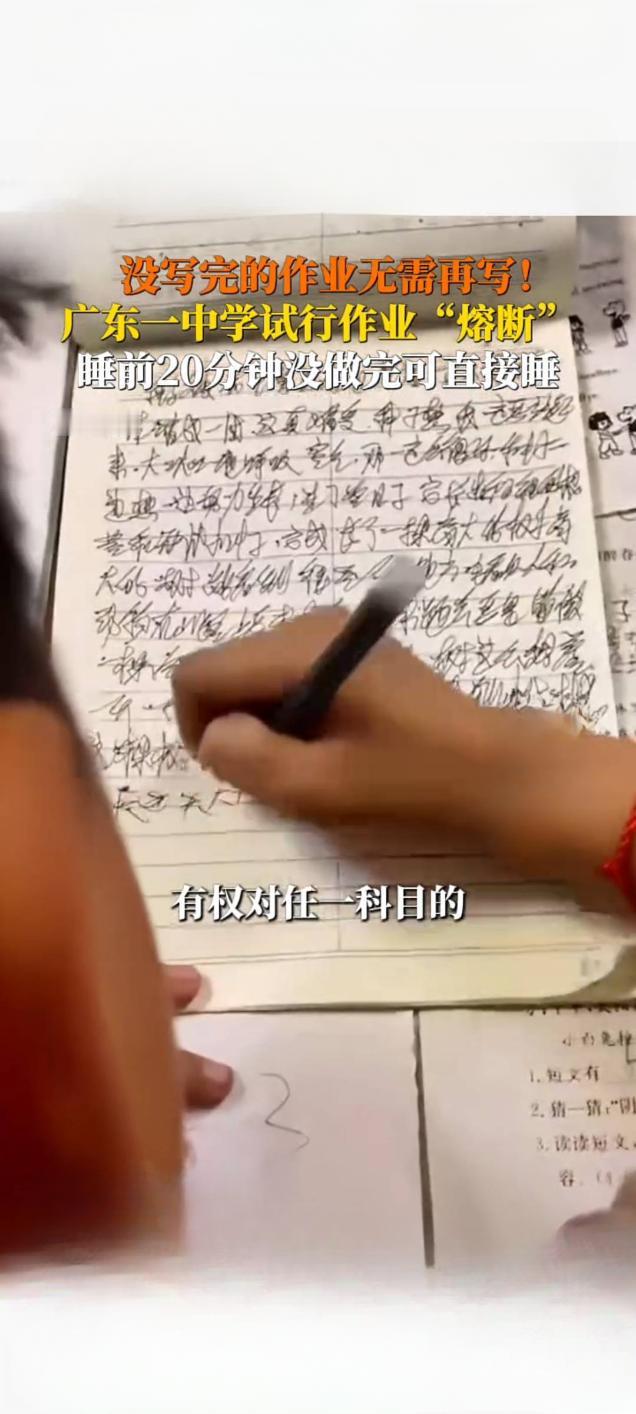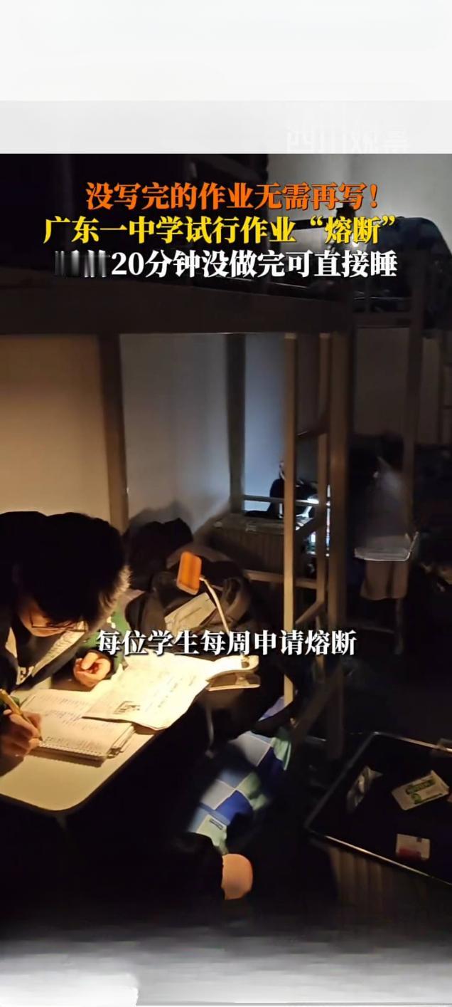 广东中学试行“作业熔断”机制 为学生睡眠健康亮绿灯 近日,广东省一所中学创新推出“作业熔断”机制,规定如果学生在睡前20分钟仍未完成作业,可选择暂停作业安心入睡,此举获得家长和学生广泛好评。据南方日报报道,该机制试行视频在快手平台播放量已达2.4万次,引发社会对教育减负的热烈讨论。 据了解,该校制定的“作业熔断”细则明确规定,每位学生每周可申请最多4次作业熔断,但同一科目一周内仅能熔断一次。这项制度旨在保障学生充足睡眠,促进学生身心健康发展,体现了学校对“健康第一”教育理念的切实贯彻。 教育专家指出,长期睡眠不足严重影响青少年生长发育和学习效率。该校推出的熔断机制创新性地平衡了学业要求与健康需求,为学生建立了合理的“减压阀”。许多网友在短视频评论区留言支持,认为“这才是以人为本的教育”,“值得全国推广”。 该举措反映了我国教育领域对“双减”政策的深入落实,展现出学校在优化作业管理、减轻学生负担方面的积极探索。教育部门表示,将持续关注此类创新措施的实施效果,推动形成更加科学、健康的教育生态。双减政策 以人为本 保护青少年发育与健康