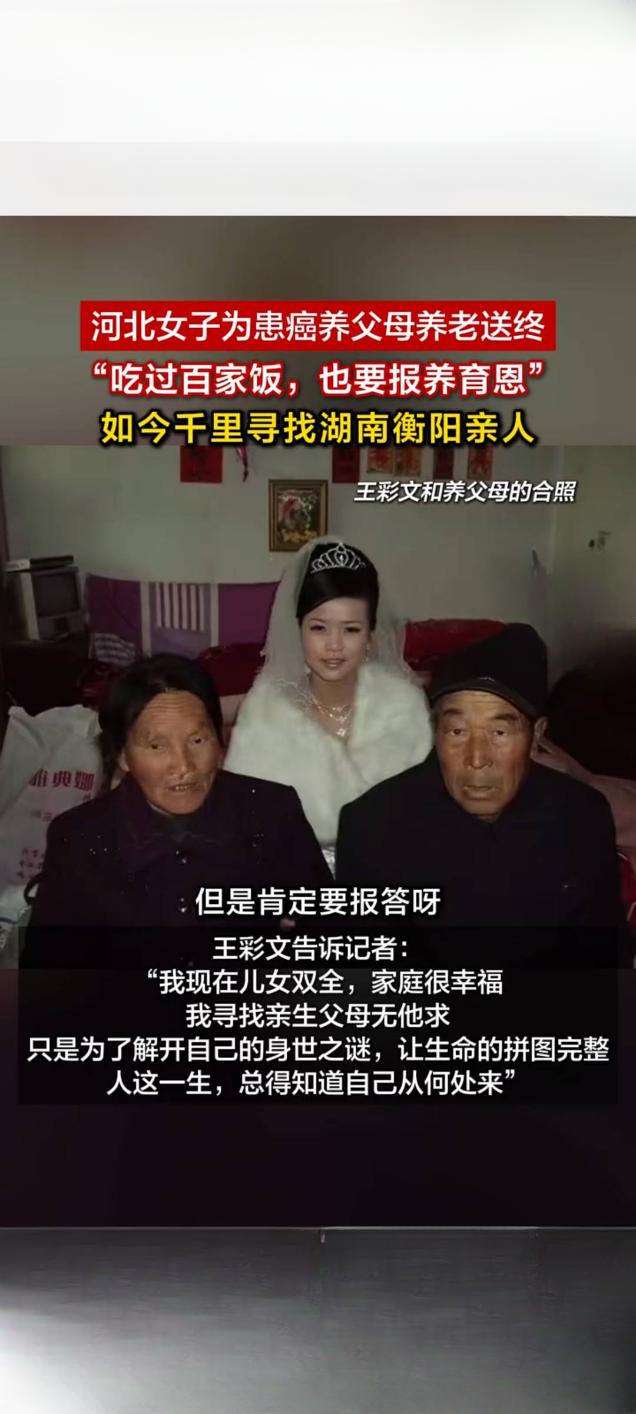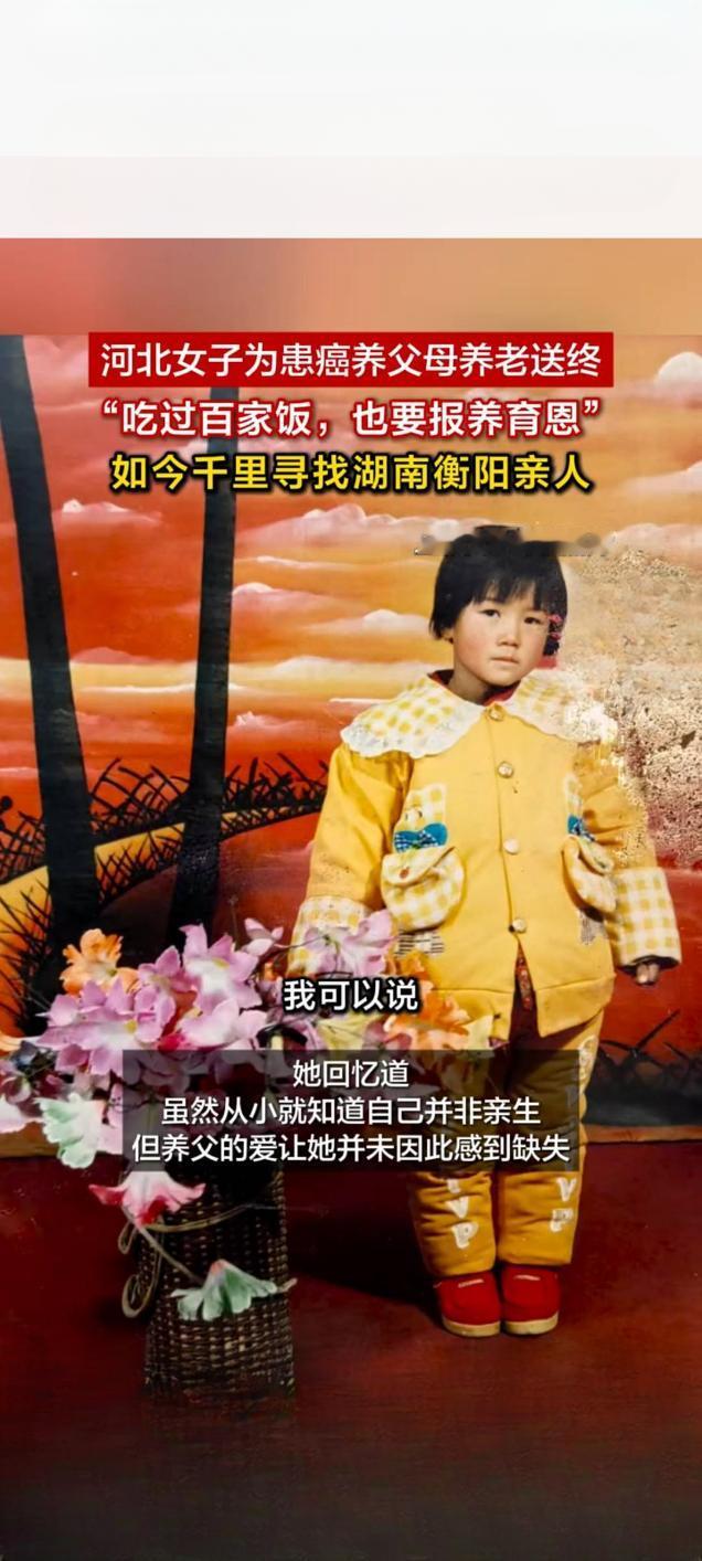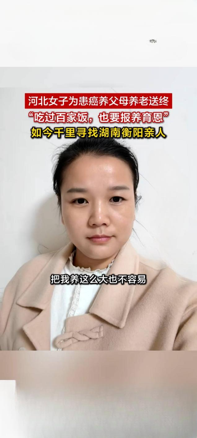 河北女子为癌养父母尽孝送终 千里寻根报恩情 一位河北女子的感人故事在快手平台获得超过9.1万次播放,她用行动诠释了“你养我小,我养你老”的至孝真情。 这位女子自幼被收养,吃着“百家饭”长大,与养父母感情深厚。然而,命运多舛,她的养父母后来不幸双双罹患癌症。面对生活的重击,她没有退缩,而是毅然担起责任,悉心照料两位老人,直至为他们养老送终,回报了那份厚重的养育之恩。 在完成了对养父母的赡养责任后,深植于心的血脉亲情让她踏上了另一段旅程——远赴千里,寻找自己在湖南衡阳的亲生父母。这份寻找,并非是对过去生活的否定,而是对生命根源的一份追寻,是希望让那份跨越血缘的恩情与血脉的羁绊都能得到圆满。 她的故事感动了无数网友。这份从“报养育恩”到“千里寻亲”的延续,展现了人间最朴素也最伟大的情感:感恩与爱。中国感恩故事 女孩感恩养父 养女归来报亲恩