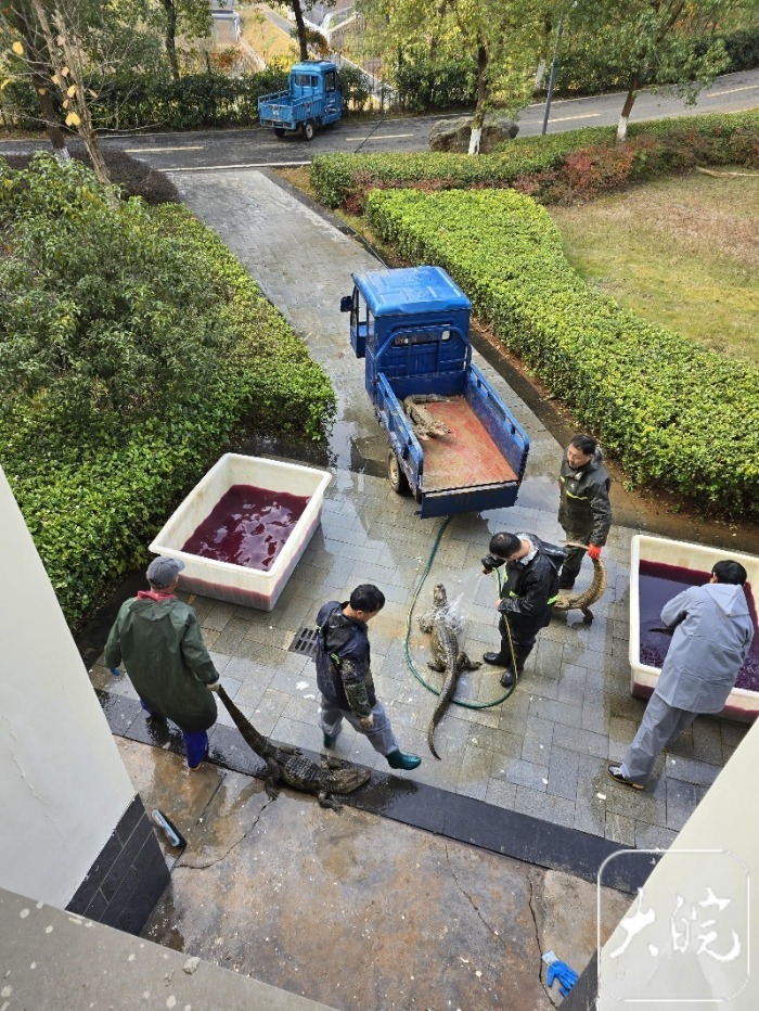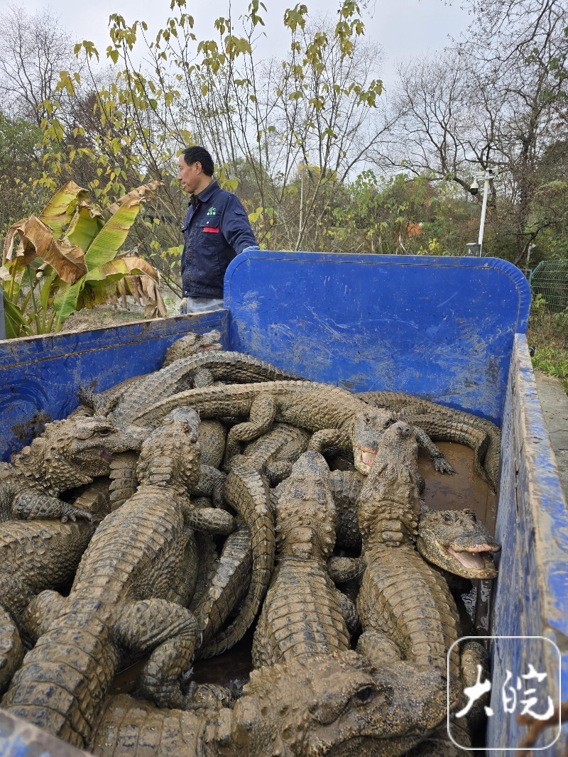 大皖新闻讯12月3日上午,在位于宣城的安徽扬子鳄国家级自然保护区内,记者看到,2025年度的扬子鳄越冬转场工作正式启动。鳄鱼池中,水位降低后,多位工作人员分工协作,将池中的扬子鳄一条一条抓捕上岸,放进运输车里。另有工作人员在一旁核实、记录相关数据,确保池内的扬子鳄都顺利转场越冬。