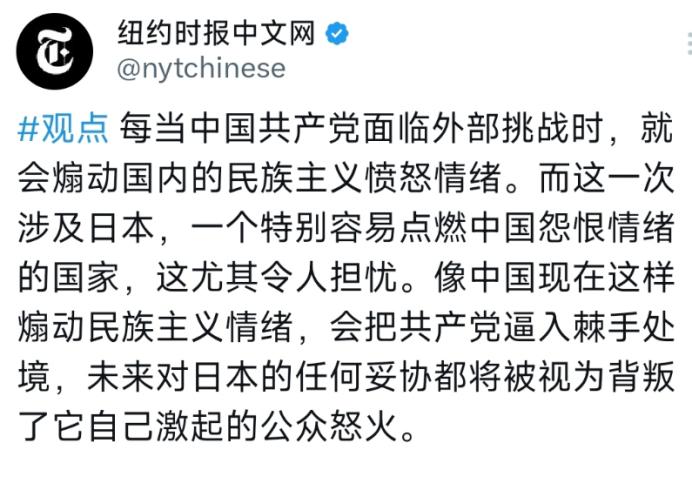 12月3日,纽约时报表示:“每当中国面临外部挑战时,就会煽动国内民族的情绪。而这一次涉及日本,一个特别容易点燃中国怨恨情绪的国家,这尤其令人担忧,未来对日本的任何妥协都将被视为背叛”。 说白了,当美国能说出这种话的时候,说明美国完全不了解中国,中国人民现在和国家,已经完全的建立了信任关系,先不说,中国面对主权这种底线问题,历来都不妥协,即便做出妥协,相信国家也是因为特殊原因做出的暂时隐忍。 其次,这也不是国家在煽动情绪,而是中国人民与生俱来的,从识字开始,从认识到日本对国家造成的伤害开始,人民就自带这种情绪,只不过中国人民向来善良,也明白历史不该代代相传,才一直隐忍克制,但是想要让历史重演,人民的情绪必然高涨。 说实话,美国这种发言,是事情没发生在他们身上,但凡这种事情发生在他们身上,估计美国比中国跳的高,毕竟任何国家都不会让另一个国家骑在头上“撒尿”,不然也就不会有战争发生了。 说到底,中国一直提倡以和平为核心,但这并未意味着中国好欺负,出来抵制是正确的选择,而反观是美国的心态不正,任何试图阻止中国发展,侵犯中国主权的行为,中国都会用正当的方式告诉他们,我们不惹事,但我们也不怕事!
