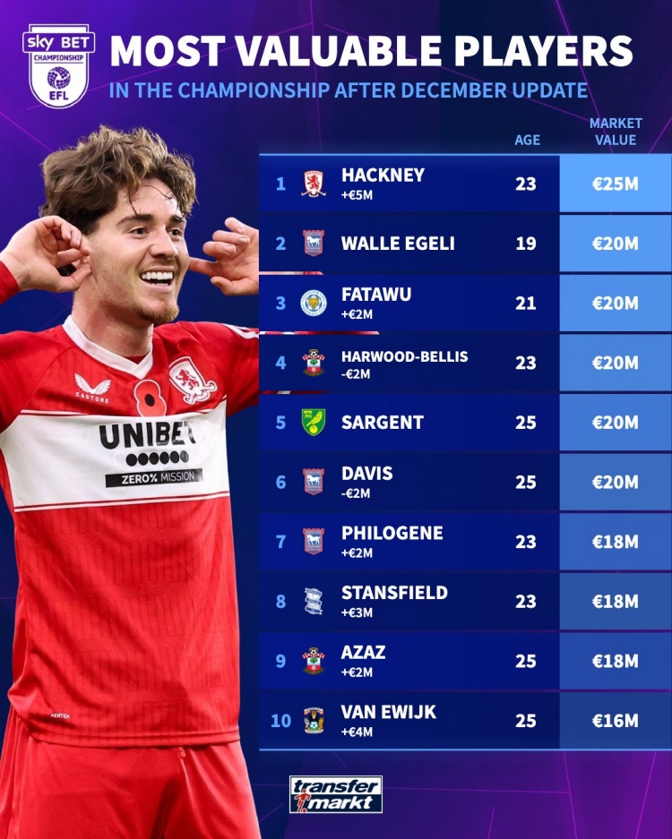 直播吧12月3日讯德国转会市场更新英冠球员身价,并列出英冠球员最新身价排名。