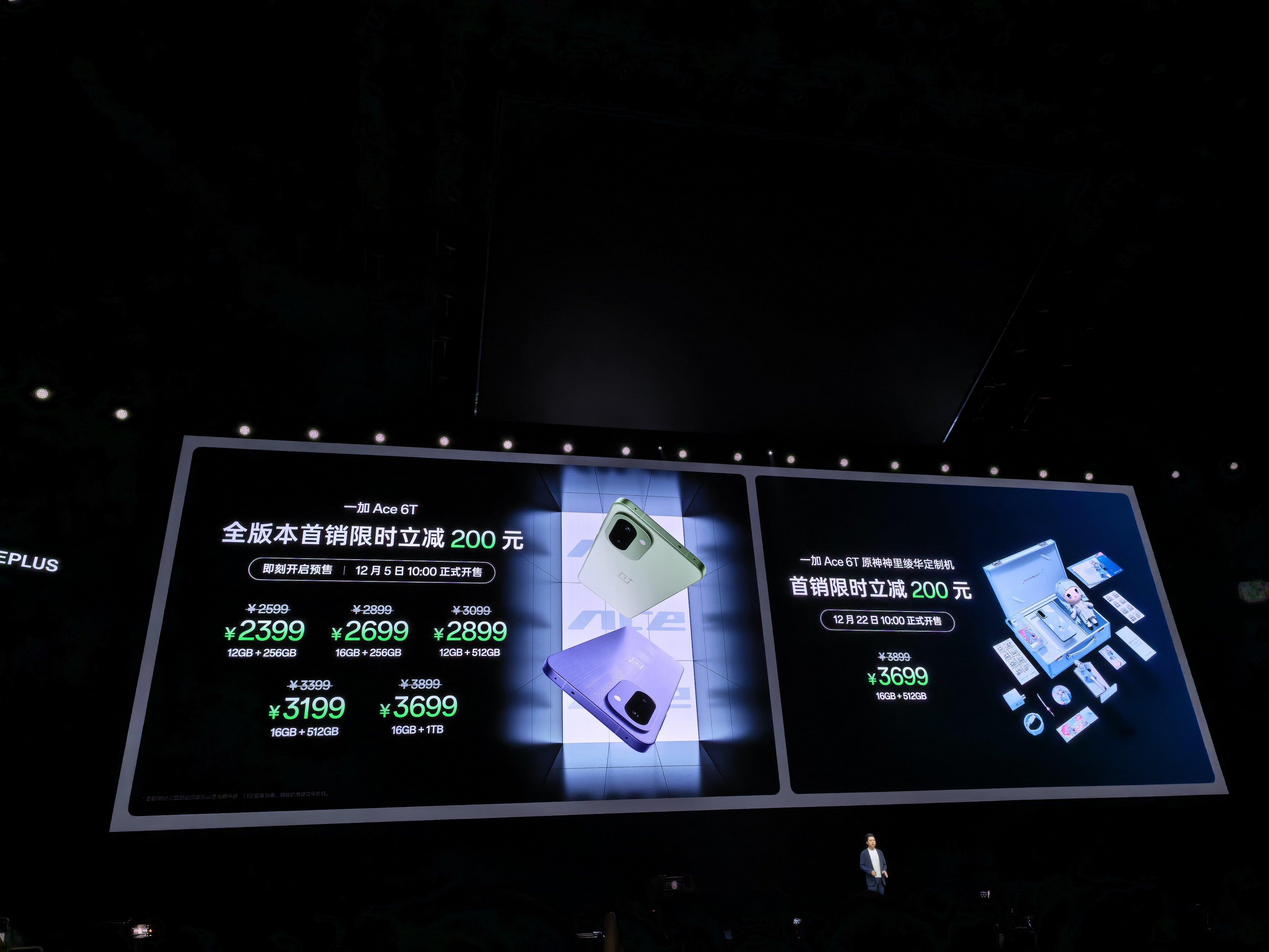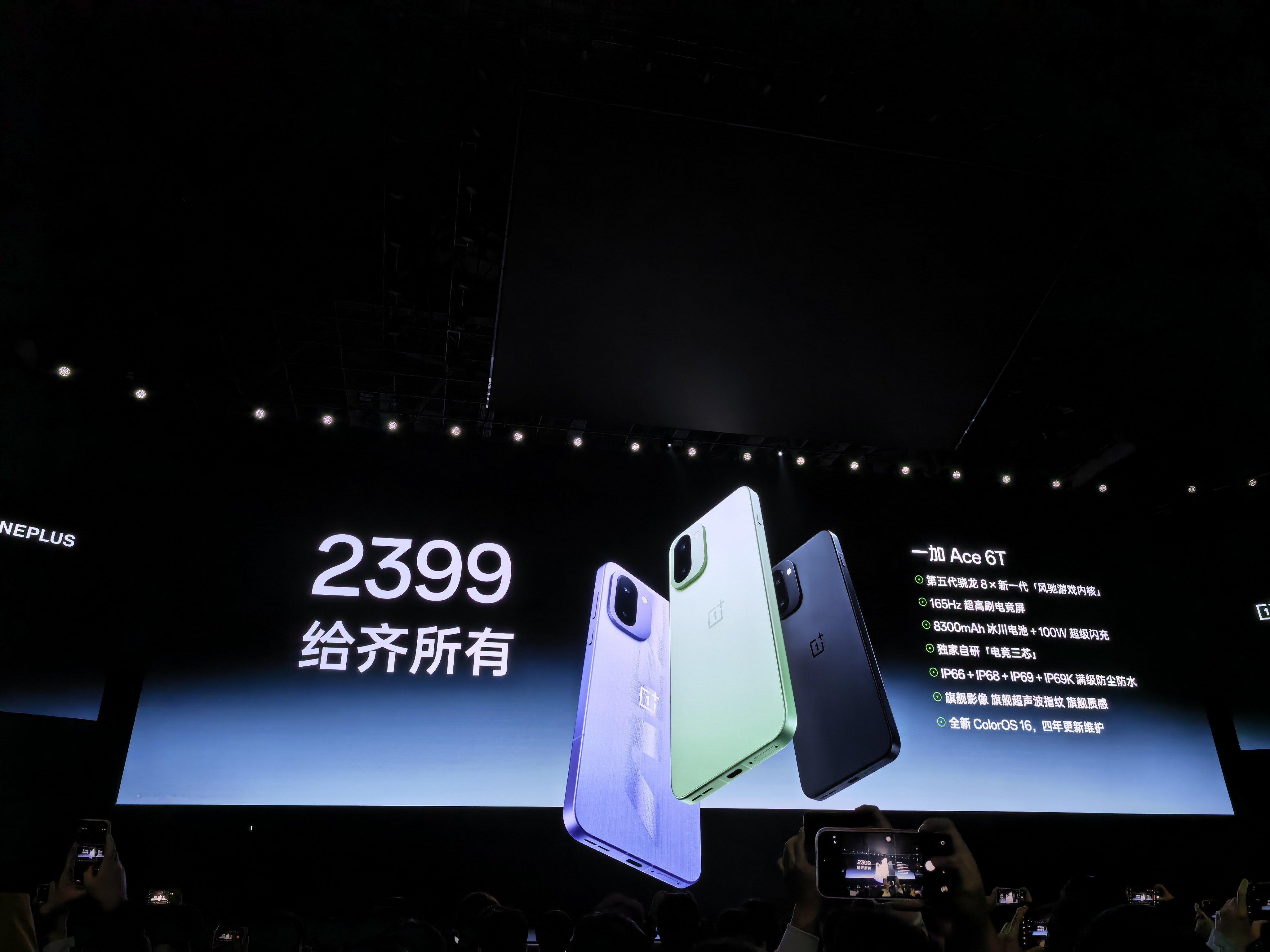 一加Ace6T的价格公布了,现在内存涨价,没想到只要2399选起,最高只要3699元!首销立减200元!如果你想用165Hz手机打游戏,必选一加!一加Ace6T新品发布你用过165Hz手机打游戏吗 杭州·萧山瓜沥文化体育中心