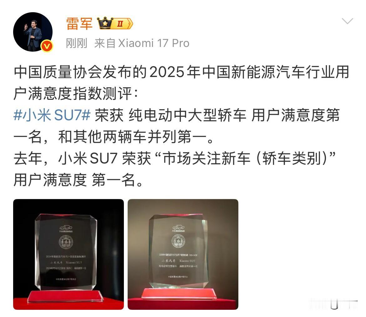 今天晚上,雷军把奖杯晒出来了! 今天晚上8:30 ,雷军在社交网络摆出了两个亮晶晶的奖杯 这个奖杯看上去试试方方的,而且晶莹剔透,上面镌刻有比较详细的获奖信息。 因为今天上午他已经把这个事情给大家说了,所以都知道他们的小米汽车获奖了,可能为了消除大家的疑惑,他把这两个奖杯也晒出来了 。 可能是背景不一样吧,因为他这个奖杯是透明玻璃材质的,所以看上去还有那么一点点不一样,其实造型上面还是一样的。 原图放在这里了,大家可以欣赏一下,看看这个奖杯漂不漂亮。