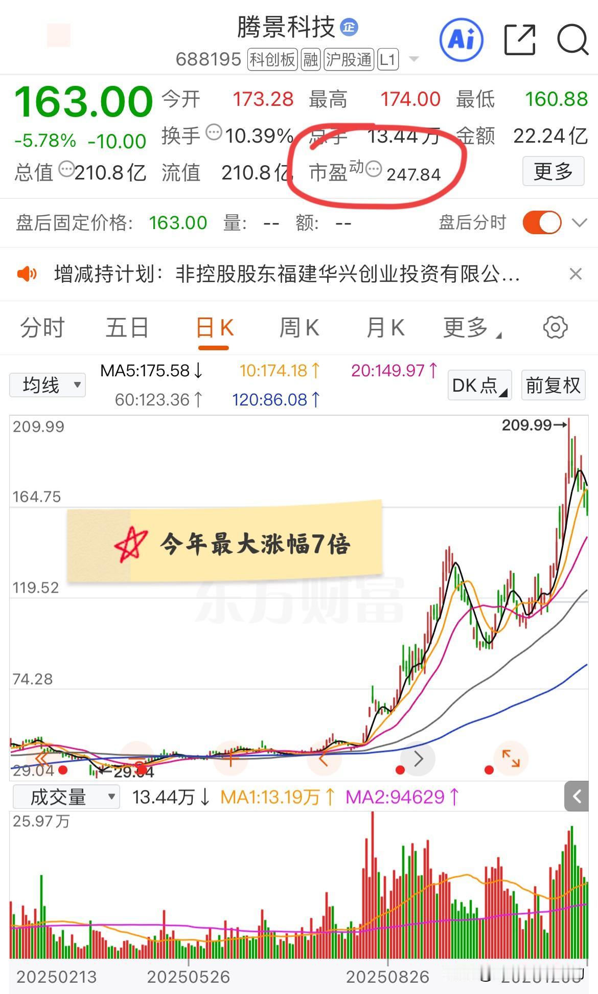 7倍大牛股腾景科技要减持了,而且是清仓式减持! 今天盘后,腾景科技发布公告称公司非控股股东福建华兴创业投资有限公司计划在3日后的三个月内减持占公司总股本的1.96%,即254.03万股! 而这也是该股东所持有的全部股份,也就是说该股东本次将是清仓式减持腾景科技!而按当前股价计算,本次该股东将套现约4个小目标! 值得注意的是,腾景科技乃是今年的一大牛股,从最低点到近日的最高点涨幅一度达到了7倍,而近期随着其因为与谷歌扯上关系而开启二波上涨并一度与光库科技和德科立有了“小易中天”之称! 在近日连续大涨后,强势的腾景科技也陷入连续调整,今日更是大跌近6%!即便如此,腾景科技的动态市盈率仍然高达247倍,显然是严重透支了公司的未来!如此看来,该股东清仓式减持似乎也无可厚非! 只是这对于因看好腾景科技未来而“抄底买入”的散户来说可能就是另一个故事了,前面的大涨是一点没吃着,明天很有可能又是一碗大面! 不过好消息是该股东虽然是清仓式减持,但是减持方式是大宗交易,这对于二级市场的冲击会小很多,但究竟如何明天见分晓!