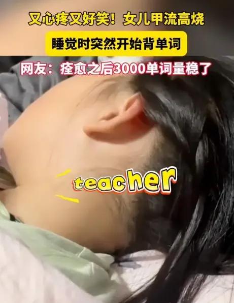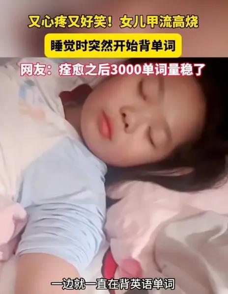 39.8℃高烧昏睡中,女孩嘴里蹦英语单词!妈妈录下视频,心疼又好笑,网友却炸锅了! 近日,河北一名女孩感染甲流,体温飙至39.8℃。吃完药昏睡后,她竟无意识背起英语单词,“worker、teacher、because”...一个接一个往外蹦。妈妈看着孩子烧红的脸,心情复杂,既揪心又觉哭笑不得。 有人调侃这是学习株,痊愈后单词量稳超3000。也有人叹息,这哪是搞笑?分明是压力大到连生病都不敢停! 医生紧急提醒!高烧说胡话其实是谵妄症状,甲流病毒可能攻击中枢神经系统,严重时可引发脑水肿!孩子生病必须彻底休息,而非输液坚持写作业。 当学习变成一种刻进DNA的本能,我们是否该反思。教育的终点,到底是健康长大,还是透支童年?有专家直言让花成花,让树成树,别把所有孩子修剪成盆景。