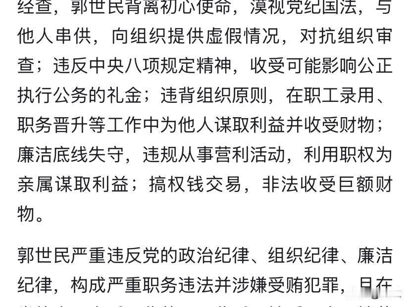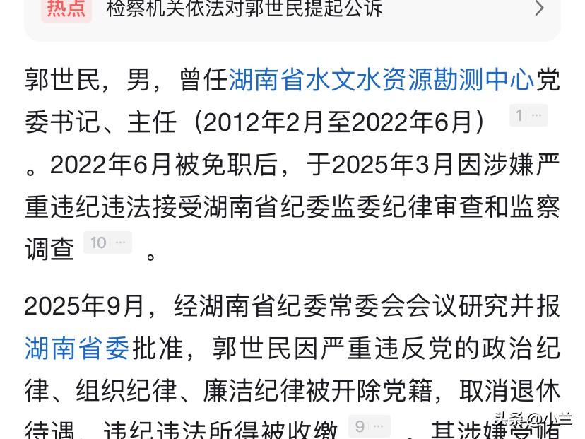 今天湖南的郭世民又上了热搜 他长期在湖南水利行业深耕 曾在湖南水利领域任过多个重要岗位 堪称水利行业的资深人士 2022年他从重要职位退下来 当时不少人都以为这是“安全着陆” 谁能想到3年后他还是走上了热搜 这也说明了一个道理: 无论在职还是退休, 只要是做了不该做的事 迟早都是要付出代价的!