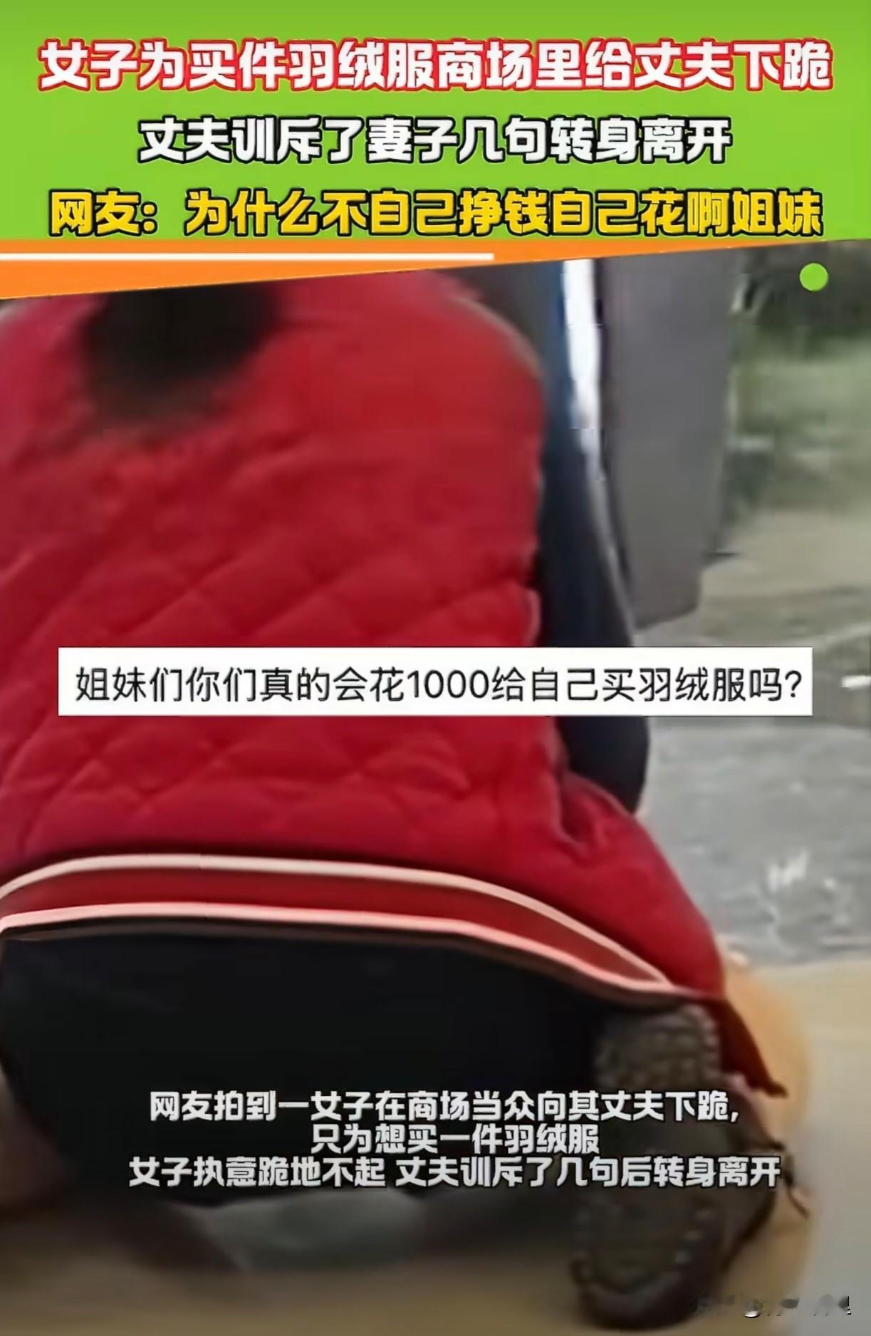 看到这样的一个视频,在湖北的某个商场里,一个女子跪在冰冷的地上,面前是她老公。女子跪下的原因是看上了一件1000块钱的羽绒服,想让老公给买下来,但老公不愿,训斥了妻子几句之后,随即转头离去。 看到这样的场景只觉得悲哀,爱不该是靠跪着求来的。婚姻里最可怕的不是贫穷,而是对方的冷漠和无视。如果对方都不在意你了,那这样的婚姻还有什么意义呢?