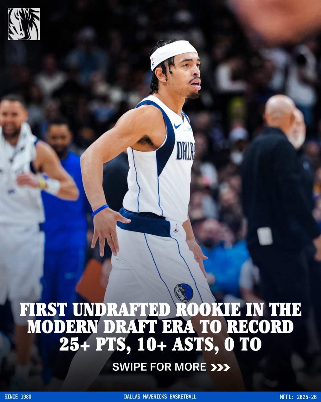 “专注的新秀!瑞安-内姆布哈德成为了自1996年的斯蒂芬-马布里之后首位单场得到25分10助攻且0失误的新秀!”独行侠官方附文道。