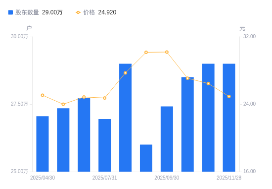 近一年(2024年12月31日至2025年11月28日),紫光股份A股股东户数从23.23万户,增加至29万户,增幅24.84%,区间股价下跌14.41%。