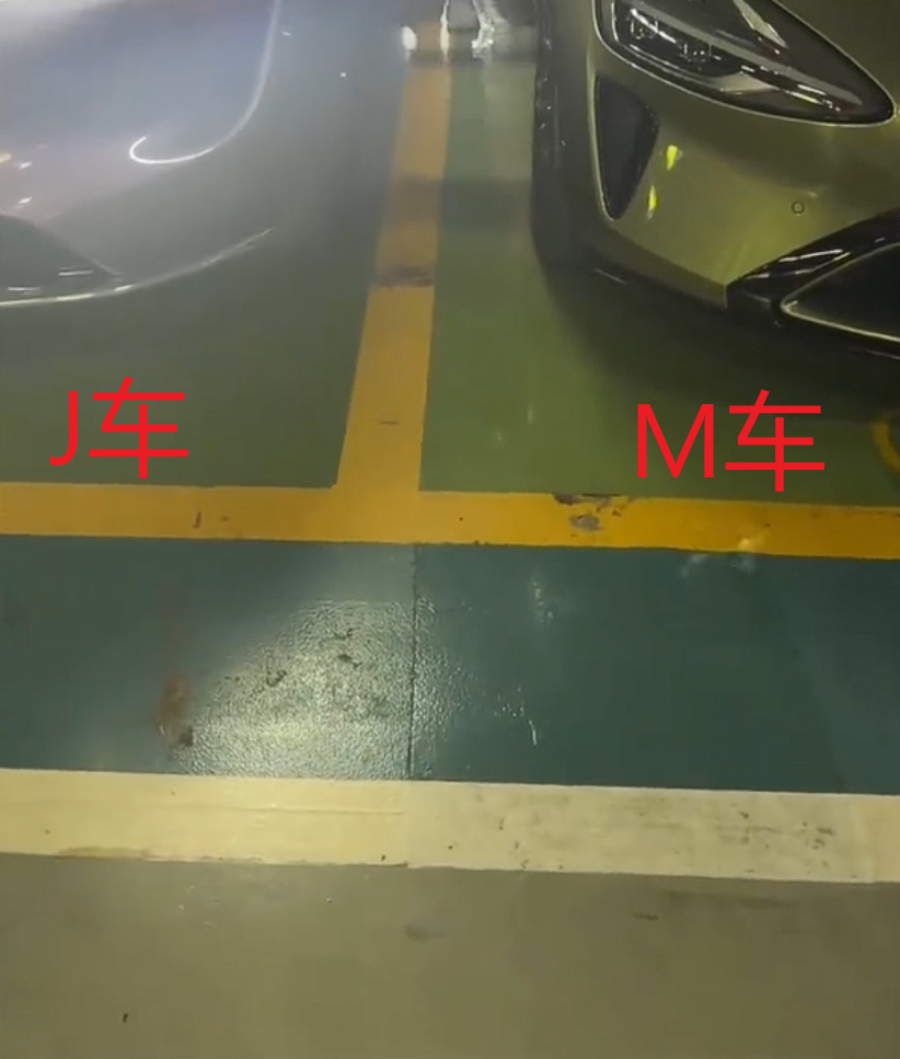 左边是J车,右边是M车(图一)。左边的J车车主开门杀碰到了M车,说右边的M车车主停车不标准,还说M车另一边留的距离太宽。我目测了一眼,M车两侧的宽度好像差不多,停车非常标准,车主也说是自动泊车停的(图二)。但J车车主就觉得,M车应该再往左侧主驾那边挪一挪,这样右侧留得够宽,J车就不会开门杀碰到M车了。M车车主认为自己停得很标准,J车车主应该往右副驾位挪一挪,但J车车主认为往右挪反光镜要擦柱子上了。最后J车车主得出了一个结论:这就是M车车主的素质。