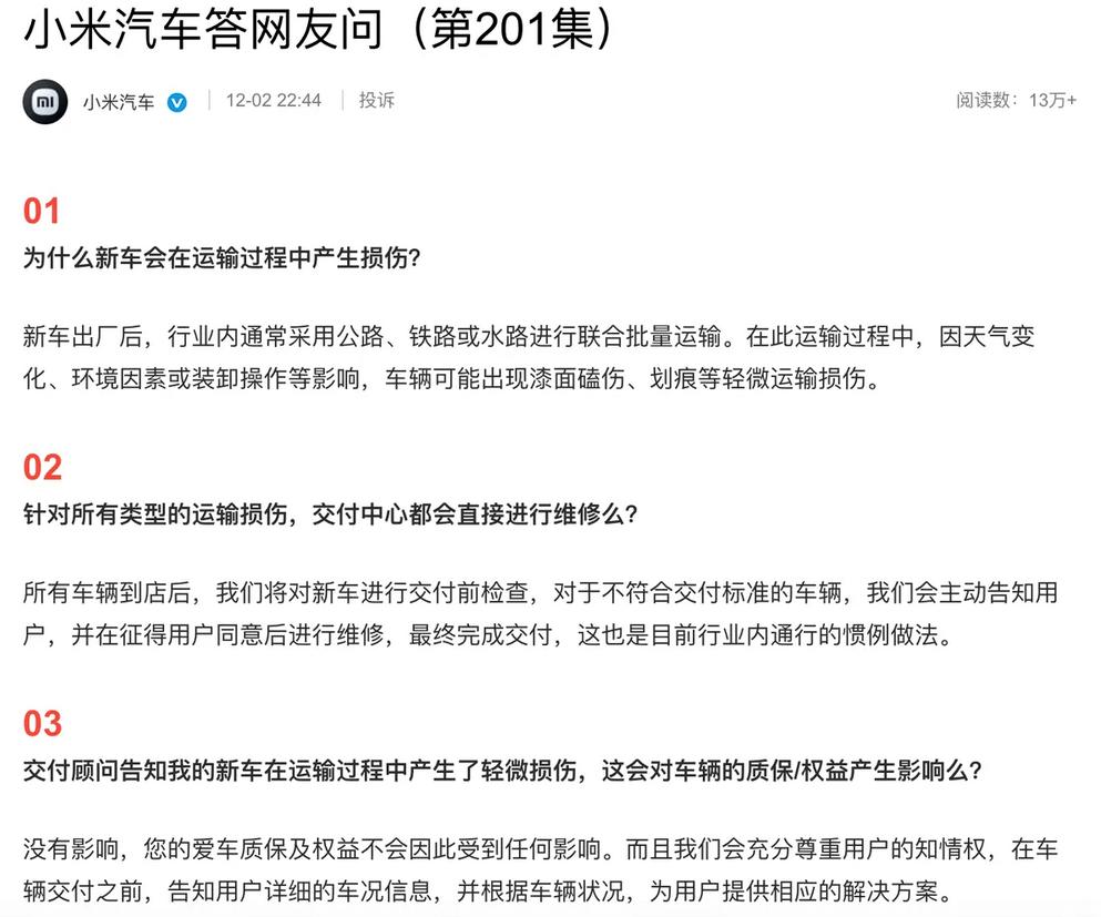 小米汽车官方回应运损车 属正常现象 近日,小米汽车答网友问(第201集)针对运损车情况进行了官方回复,主要涉及3个问题,分别是为什么新车会在运输过程中产生损伤?针对所有类型的运输损伤,交付中心都会直接进行维修么?交付顾问告知我的新车在运输过程中产生了轻微损伤,这会对车辆的质保/权益产生影响么?具体答复内容如图。 参考事件: 12月1日,郑州的许先生定了一辆小米YU7,苦等5个月,结果等来一辆运损车。郁闷的许先生表示,自己不要维修,也不要积分,也不想再耗时间重新等待生产了,现在只想要退定金。 小米汽车交付中心回应称,家大业大,需要走流程。 点个关注吧!汽节车社,车圈热点资讯每日一扫清!【来自懂车帝车友圈】