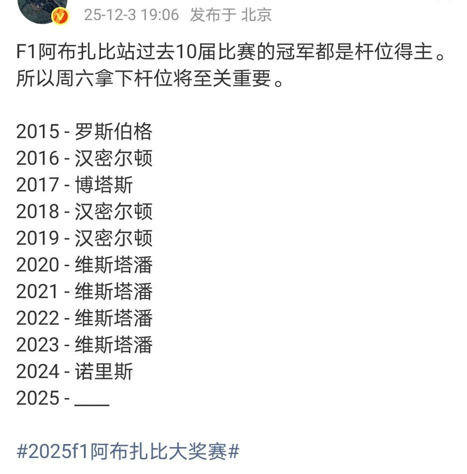 前法拉利车手塞恩斯过去三站比赛的得分,是两位现法拉利车手过去3站的总和。 F1阿布扎比站过去10届比赛的冠军都是杆位得主。