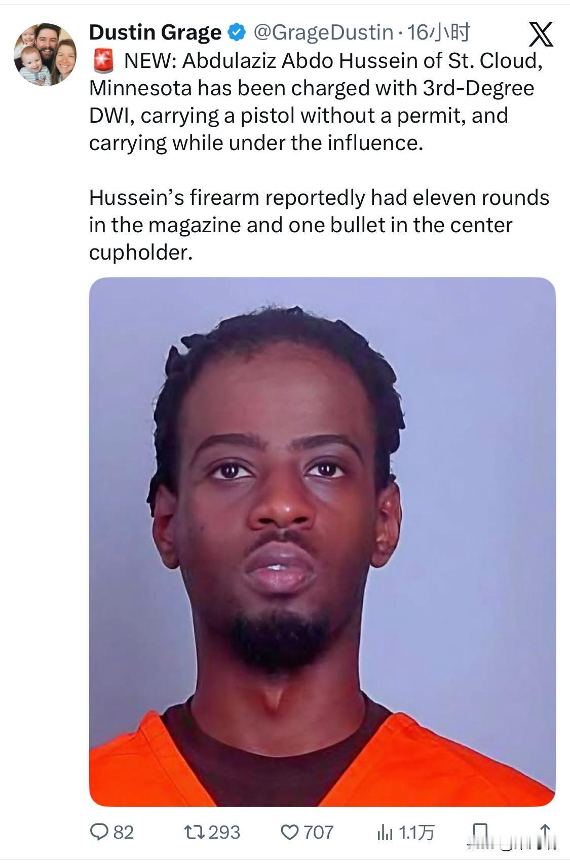 最新消息:明尼苏达州斯特恩斯县 (Stearns County) 圣克劳德市的阿卜杜勒阿齐兹·阿卜杜·侯赛因被指控犯有三级酒后驾车罪、无证携带手枪罪和酒后携带枪支罪。 据报道,侯赛因的枪弹匣里有 11 发子弹,中央杯架里还有一颗子弹。 根据法庭和执法记录,阿卜杜勒阿齐兹·阿卜杜·侯赛因(Abdulaziz Abdu Hussein)于2024年12月21日因涉嫌多项指控在明尼苏达州斯特恩斯县(Stearns County)被捕。 他面临的指控包括: 三级酒后驾车(DWI) 无证携带手枪 酒后携带枪支 根据斯特恩斯县治安官办公室的记录,逮捕/拘留并不等同于定罪。