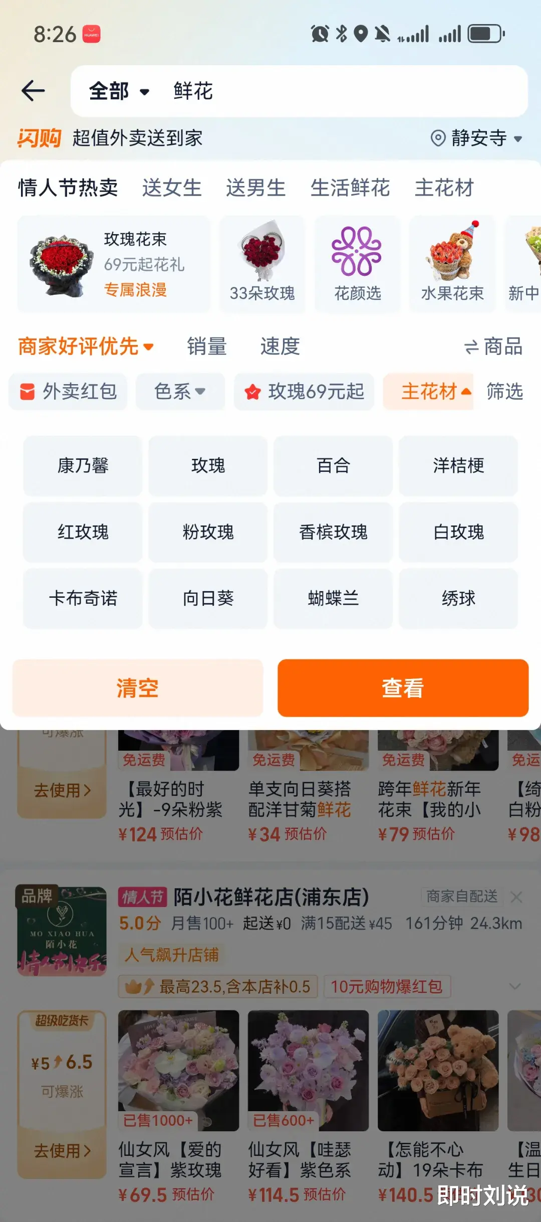 用户体验与转化提效:笔者发现,近期淘宝闪购在礼品花频道的搜索筛选模块进行了升级,在其鲜花的下拉导航中新增了色系、朵数、主花材等结构化筛选选项,帮助用户快速精准定位所需产品。同时也新增了“玫瑰69元起”等价格指引模块,力求提升转化效率与客单价。