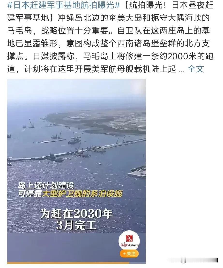 战争已指日可待! 日美联军将在2030年完全成形! 当下,日军正在琉球岛是加速扩建日美联军军事基地,为美军航母舰载机提供最为快速高效的起降通道,并预计2030年完工: 到时一支庞大的拥有陆海空三位一体作战能力的日美联军将现身亚太。 战争已指日可待,亚太形势之严重已可想而知……