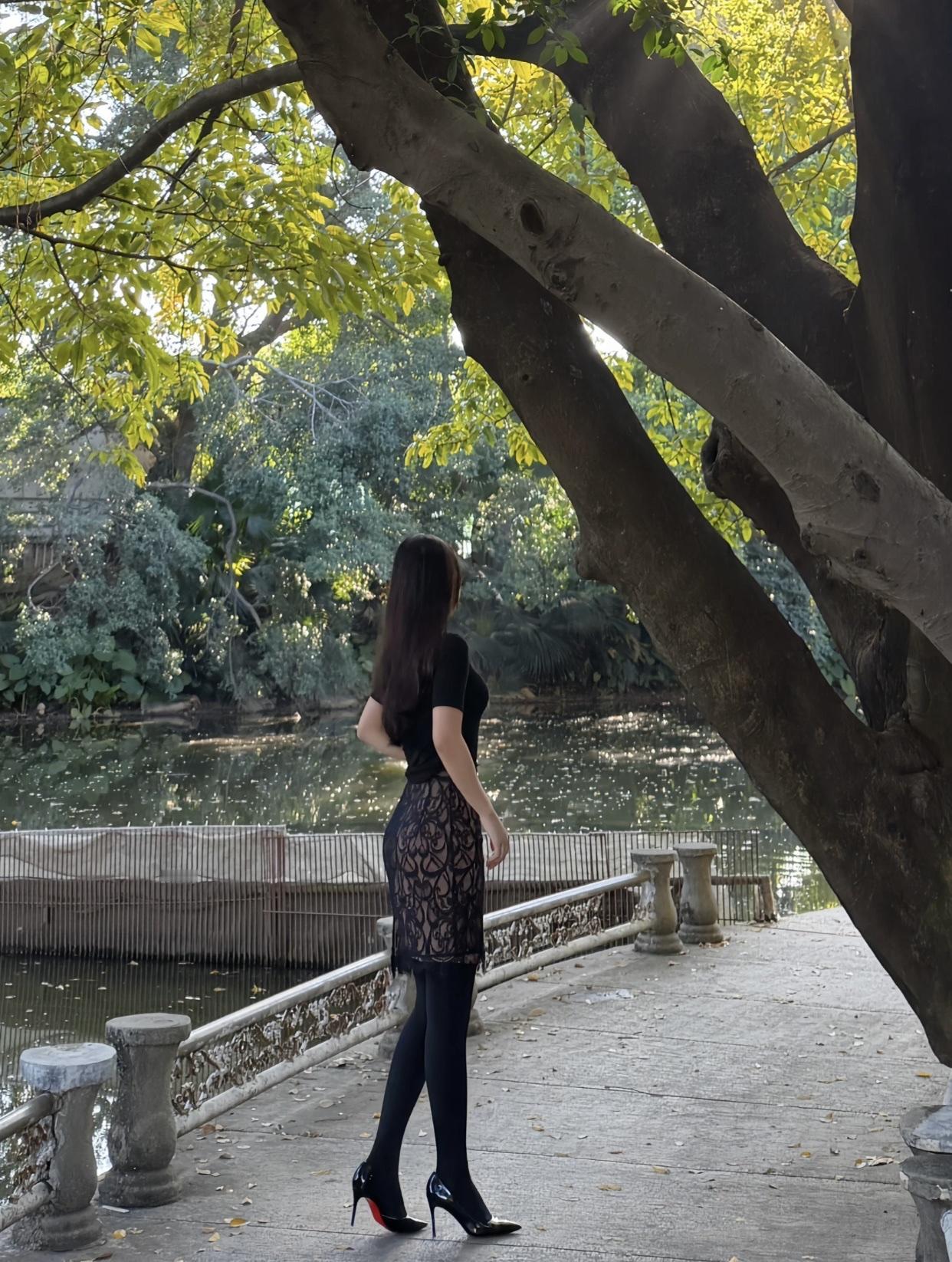 秋日漫步,绿意盎然,优雅黑裙,漫步林间。秋色漫步