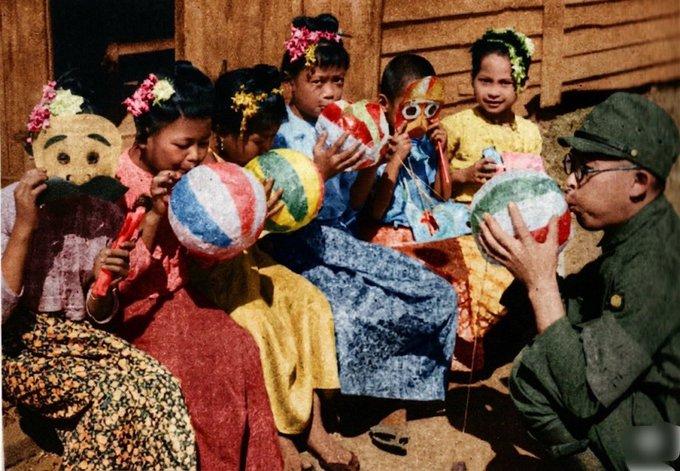 1941年太平洋战争爆发后,日本为掩盖其侵略野心,提出 “大东亚共荣圈” 口号,谎称 “解放亚洲国家摆脱西方殖民统治”。这张所谓 “缅甸儿童与日本士兵欢乐互动” 的照片,是由日本军方宣传部门统一策划摆拍,通过报纸、明信片等渠道传播,试图塑造日本士兵 “亲善者”“解放者” 的虚假形象,麻痹当地民众、争取国际舆论同情。