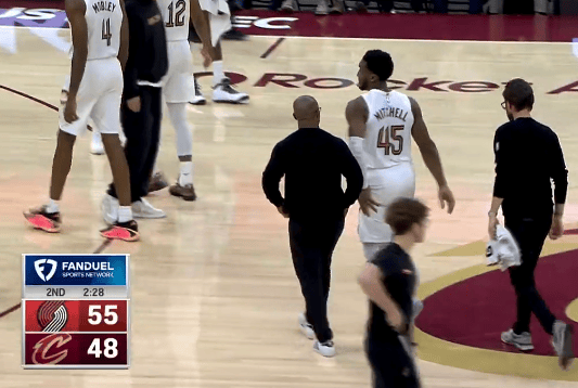第二节比赛中,米切尔突破时脚滑出现轻微拉伤,随后自己站起来走回替补席。