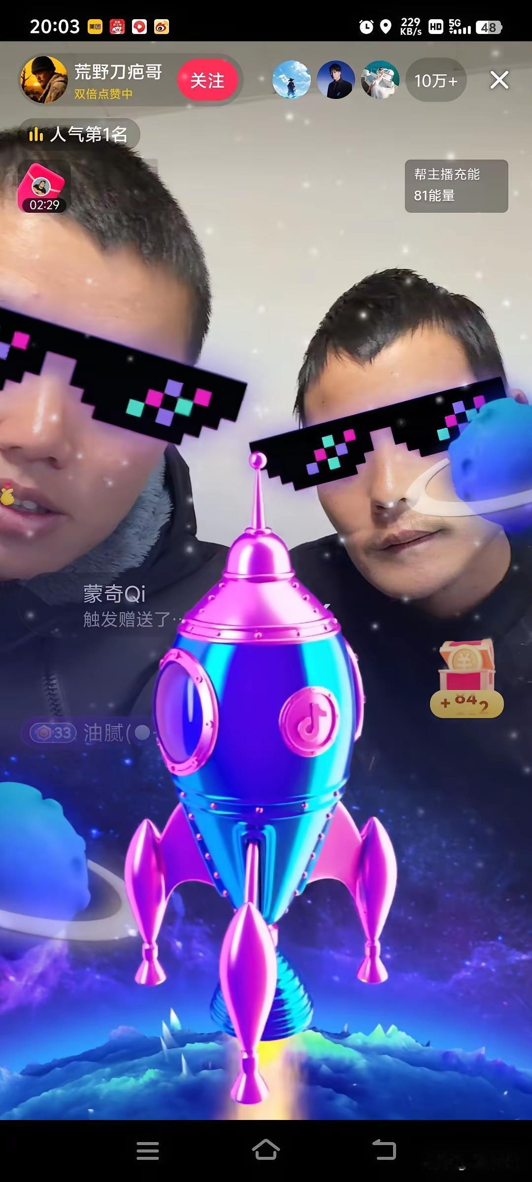 刀疤哥也是得道成仙了,首次直播人数就达10万之多,礼物满屏飞,豪车火箭目不暇接,俩人的头离屏幕越来越近,从最初的紧张到被礼物砸懵,估计自己也没想到这泼天的富贵就这么来了,人生已经到达了巅峰!