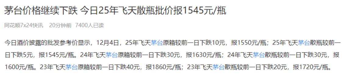 茅台批发价跌到1545元,离1499仅一步之遥! 某电商平台已经补贴后已经1399了,这个价格所有的茅台经销商都会亏钱了,茅台还有不少的下跌空间,先看到1000左右吧。 接下来,可能会倒逼酒厂降价,现在的出厂价1169,下游根本没有利润。参考房价,回到十年前的水平就可以了