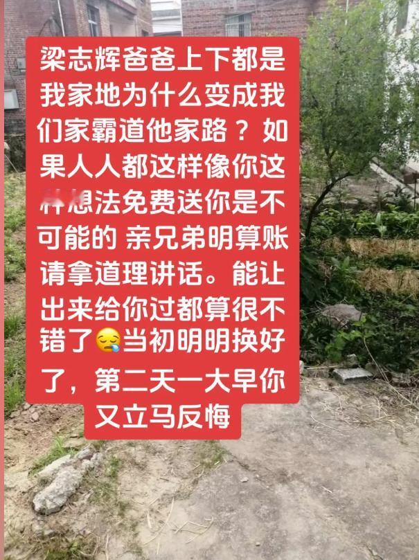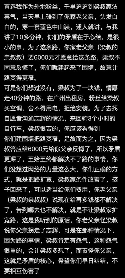 梁志辉爸爸家门前的小路火了,一条只能侧身过去横七竖八的小路,铺上红地毯迎接了梁志辉回家,也是这条路引起了很多很多热心人的关注,大家现在才搞明白,这家原来是梁爸的亲叔叔家,现在梁爸的堂兄妹公开说他们家的围墙合理合法,指责梁爸从来没出面和他们协商过,之前梁爸爸亲叔叔提过用6000元买这条路,但是后来也没谈妥,两家的矛盾也越来越深。 在没找到儿子的时候,梁爸爸在外面,吃住能省都省了,钱用在必须要用钱的时候,所以当时的6000元对梁爸爸可能又难言之隐,我们理解他可能没有太多的钱来买地,现在志辉回家了可以好好协商一下解决,即使是邻居天天见面的,远亲还不如近邻呢,更何况是亲叔侄呢。 一位参加认亲的外地网友说,志辉认亲当天碰到了这位发视频的堂兄妹的父亲,老人也讲了两家的纠葛,最初就是要梁爸爸花6000元买这条路,梁爸爸反悔了,他们就建起了围墙,可能志辉的丢失双方也有误会,导致矛盾更深,现在老人说给再多钱都不解决了,这位堂兄妹倒是说可以讨论以地换地,但是也不会平白无故的妥协,这个事情最终解决,还是要两家坐下来清平气和的商量