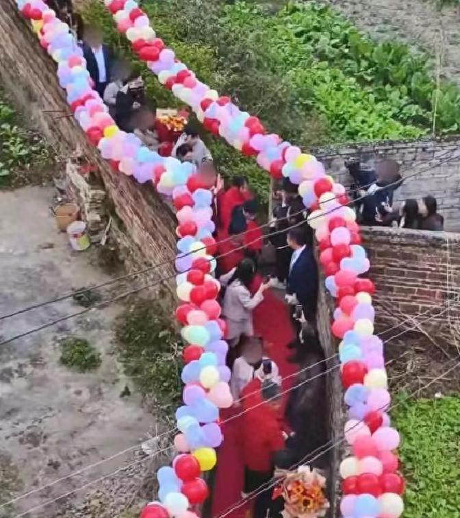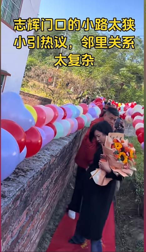 梁志辉爸爸家门前的小路火了,一条只能侧身过去横七竖八的小路,铺上红地毯迎接了梁志