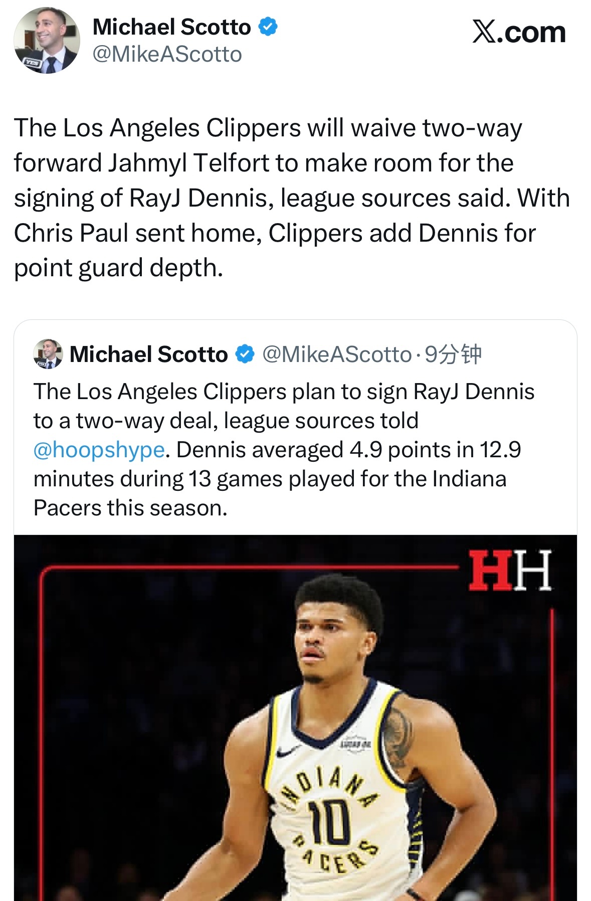 Jake Fischer:快船队将与雷吉-丹尼斯签下一份双向合同。丹尼斯此前曾效力于该队的发展联盟附属球队。在保罗离队后,他将立即填补球队控球后卫位置的深度空缺。 Scotto:洛杉矶快船队将裁掉双向合同前锋贾米尔-特尔福特,为签下雷吉-丹尼斯腾出名额。