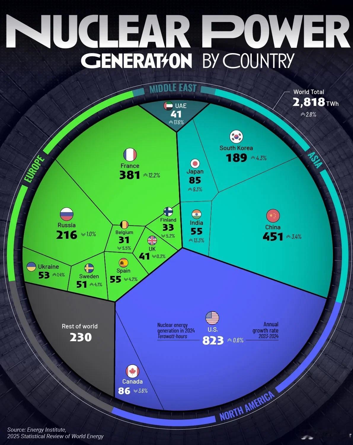 全球核电的格局,正悄悄上演一场龟兔赛跑。 领跑的美国,现在有点跑不动了。它拥有全球最多的在运反应堆,发电量也遥遥领先。但它的新建项目几乎陷入停滞。最近投运的两个机组,花了十多年、耗资一百七十亿美元才建成,可谓“十年磨两剑”。与此同时,中国正以平均每十年建成数十座的速度追赶。如果按这个势头,中国的核能发电量可能在2030年前反超美国。 各国的核电战略天差地别。法国是绝对的“重度依赖者”,全国约七成电力来自核能,这个比例全球第一。韩国、斯洛伐克、匈牙利等国,核电也占到了全国发电量的三到五成,是能源安全的支柱。 而中国则呈现另一幅图景。尽管核电总装机容量已位居世界第二,但它在全国发电总量中的占比还很低,不到5%。这主要是因为中国的能源盘子实在太大了,目前仍以煤电为主。但中国的追赶决心和速度是惊人的。目前全球在建的核电机组中,约有一半在中国。它的目标是将核电占比在2030年提升到10%,并在更远的未来继续增长。 技术的领导力也在转移。俄罗斯凭借先进的快中子反应堆技术和全球最大的核燃料产能,巩固了其技术输出国的地位。它拥有全球最庞大的海外核电站建设订单。而国际能源署的数据显示,过去几年全球新开工的核电机组,全部采用中国或俄罗斯的设计方案。 在这场竞赛中,也有些国家选择了离场。德国在2023年关闭了所有核电站,彻底转向可再生能源。日本在福岛事故后大幅缩减核电,目前正艰难重启,占比缓慢回升。 所以,核电占比的高低,就像一个国家的能源性格。它反映了资源禀赋、技术路线和安全考量的根本差异。一边是法国、韩国等将核电视为低碳基荷能源的核心;另一边是德国彻底放弃,以及中国这样虽然当前占比低,但正以惊人速度建设、并瞄准下一代技术的追赶者。 这场静默的竞赛,最终将重塑全球能源与地缘政治的版图。当老牌强者步履蹒跚,新兴力量正在建设未来。核电的故事,远不止于发电量的百分比,它关乎一个国家如何定义自己的能源未来。核电制造 核电产业 核能核电 核电行业