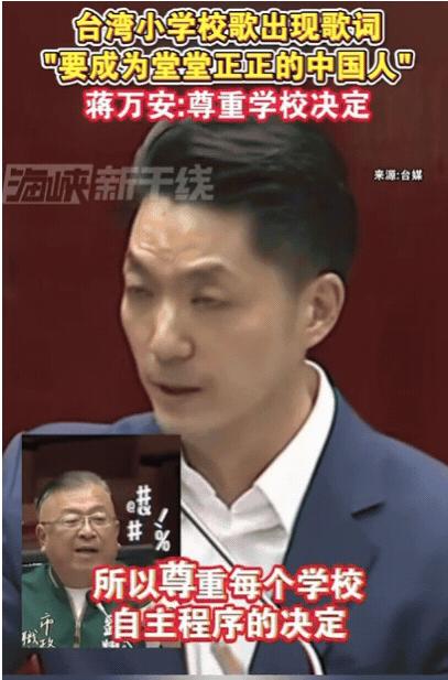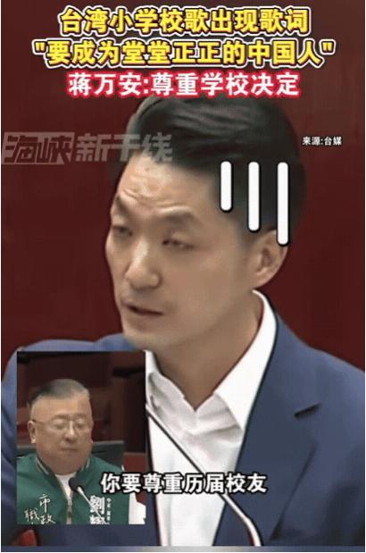 “台独”急眼了,台湾小学校歌歌词中,竟然出现了“要成为堂堂正正的中国人”!民进党籍台北市议员刘耀仁率先发难,质问市长蒋万安:市长,你告诉本席!现阶段台北市各学校也好,歌词出现了要成为堂堂正正的中国人!这段歌词适不适当? 事情的源头得从台北市河堤小学的新校长上任说起,这位校长觉得学校的旧校歌更能传承精神内核,就决定让学生们重新传唱,没成想这一决定直接戳中了 “台独” 的敏感神经。 旧校歌里 “做活活泼泼的好学生,当堂堂正正的中国人” 这句歌词,在民进党籍议员刘耀仁眼里成了 “大逆不道” 的存在。 12 月 1 日的台北市议会质询现场,他情绪激动地拍着桌子质问蒋万安,声称现在都什么年代了,还让学生唱这种 “不合时宜” 的歌词,甚至质疑新校长 “居心何在”。 他还翻出两年前的旧账,说时任校长已经觉得歌词不符合时代潮流,成立了校歌修正小组,家长会还自筹 10 万元新台币制作了新校歌《河堤之歌》,现在新校长一句话就推翻之前的 “民主成果”,完全是凭着个人意识形态行事。 刘耀仁的发难像是吹响了集结号,其他绿营人士也纷纷跟风起哄。台湾基进秘书长吴欣岱直言没办法接受自己的孩子唱这样的校歌,还离谱地说 “没有家长会希望自己的小孩,唱成为拿着飞弹对着我们的人”,把正常的身份认同和政治对抗强行捆绑。 民进党发言人陈培瑜更是上纲上线,指责蒋万安的回应是 “纵容威权复辟”,声称这会让校园变成 “统战战场”。 他们一边喊着 “教育去政治化” 的口号,一边却把一首传承了几十年的校歌当成政治斗争的工具,这种双重标准实在太过明显。 面对绿营的集体发难,台北市长蒋万安的回应倒是干脆利落,他明确表示每个学校都有自主决策的权利,校歌的修订应该尊重学生、老师和历届校友的意见,不应该对校歌进行政治审查。 台北市教育局长汤志民也跟着表态,支持学校按照自身程序做出决定。这番回应让绿营的算盘落了空,却赢得了不少台湾民众的认可。 其实这已经不是民进党第一次对 “中国人” 相关的表述大动干戈了。台中市一所百年小学的校歌因为有 “新中国的创造”,就被绿委指责是 “统战渗透”;台湾师范大学校歌里的 “重归祖国” 更是被强行删除,只留下曲调重新填了新词。 就连香港歌手刘德华去年底在台北小巨蛋演唱《中国人》时,都遭到绿营政客集体离场抗议。他们越是这样草木皆兵,越能看出内心的焦虑,毕竟想要切断两岸的文化联结,可不是靠删歌词、禁歌曲就能实现的。 这场风波在台湾社交媒体上引发了热烈讨论,不少网友忍不住吐槽 “绿色恐怖要来了吗”,批评民进党 “遇中必仇、遇中必反,把什么都政治化,已经丧失理性了”。 有网友分享自己小学时就唱着同款歌词的校歌,度过了六年时光,实在不明白为什么现在会被当成问题。还有人灵魂拷问绿营:“要是不承认是中国人,那拜的神、过的节、说的话、写的字,难道都要一并抛弃吗?” 更有数据显示,即便民进党多年来推行 “去中国化” 教育,2025 年 10 月台湾智库的民调仍显示,58% 的受访者认为 “台湾文化是中华文化的一部分”。 河堤小学的旧校歌创作于李登辉时期,当年全校师生共同参与创作,每个字都凝聚着对中华文化的认同,这样的文化传承本应被珍视,却因为政治操弄被推上风口。 而绿营越是急着跳脚反对,越反衬出这种文化认同的强大生命力,毕竟刻在骨子里的根脉,从来不是靠政治打压就能轻易斩断的。