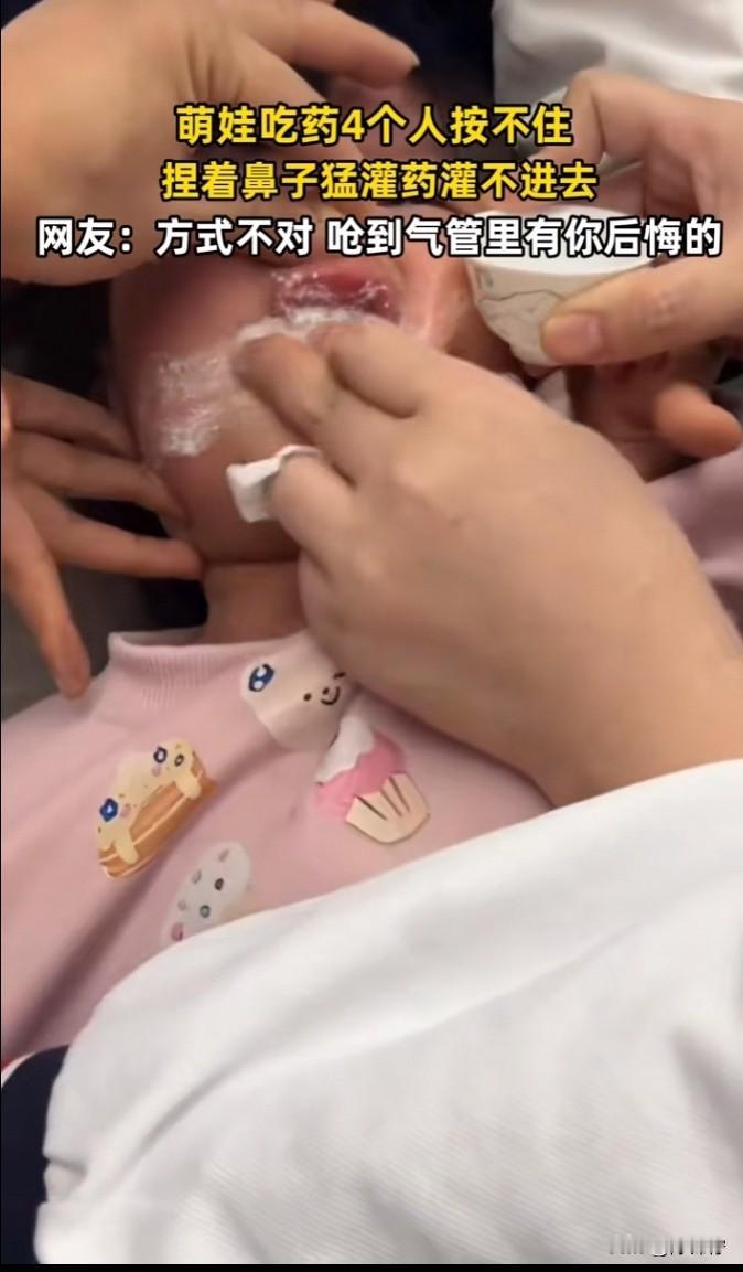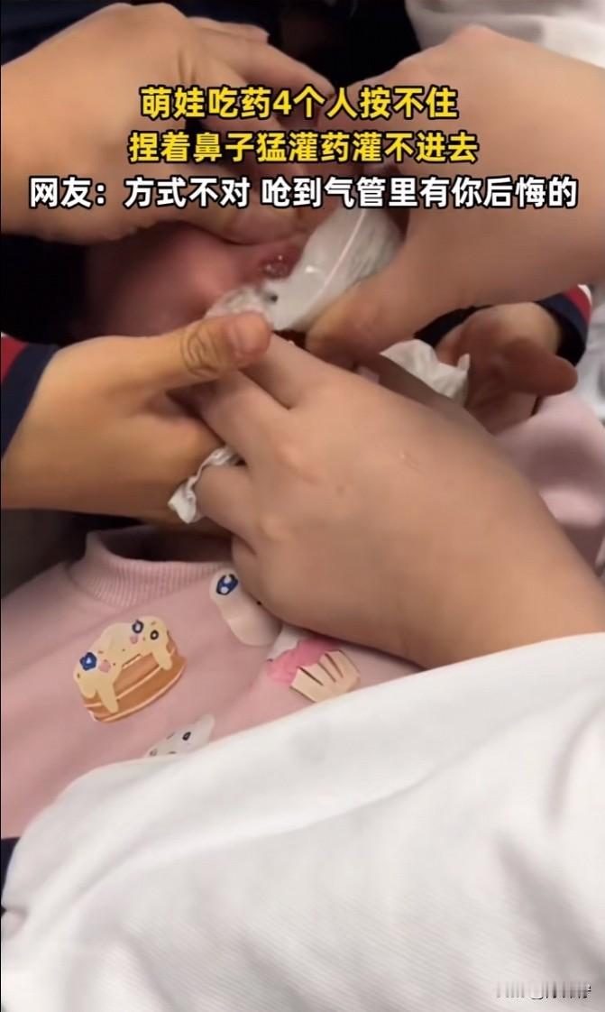 这场面看的好窒息!近日,广东一小娃娃生病,奈何怎么也喂不进去药,几个大人就把孩子按在地上,捏着鼻子,扳开嘴巴猛灌药,孩子小脸憋的通红,看着就要呼吸不过来了,难受的很,最终药也没喝下去多少。 做家长的都知道孩子生病时,喂药有多难,但是“暴力灌药 ”还是很危险的。 这种做法不可取:捏住鼻子会被迫张嘴呼吸,而药就很容易呛进气管,轻则会咳嗽引发肺炎、重则窒息、引发气道痉挛,后果还是很可怕的。 ai指出正确喂药该怎么做: 1.用喂药器(避开舌头根部,沿嘴角慢慢推),别用勺子/碗猛灌。 ​2. 年龄小的可以用“安抚喂药法”:抱着娃、语气温柔,少量多次喂。 ​3. 实在抗拒,先别逼!等娃情绪稳定了再试,或者咨询医生能不能换口感温和的剂型(比如水果味的冲剂、滴剂)。 孩子吃的药 喂小孩药 喂小孩吃药 宝宝被呛 婴幼儿喂药