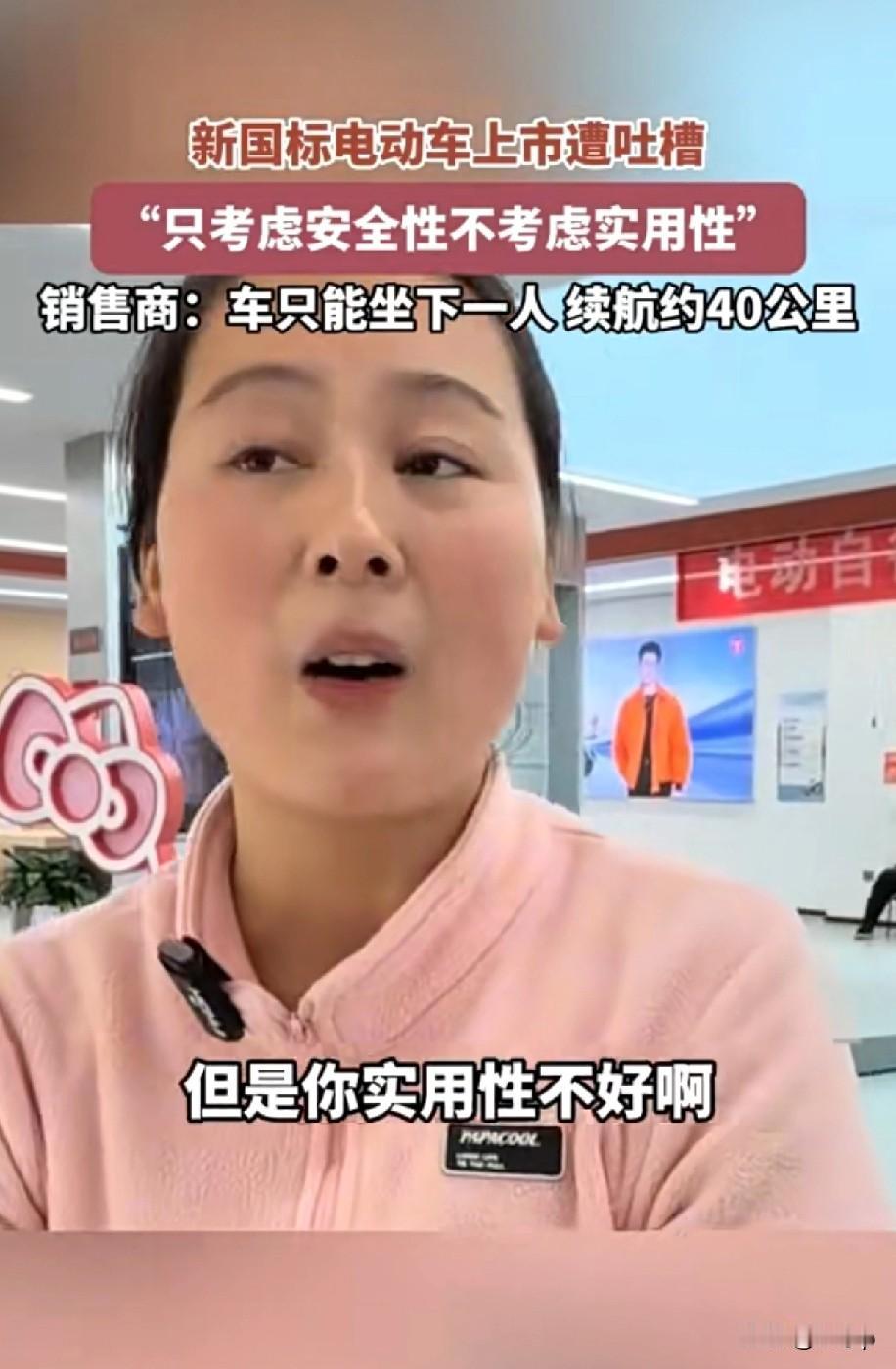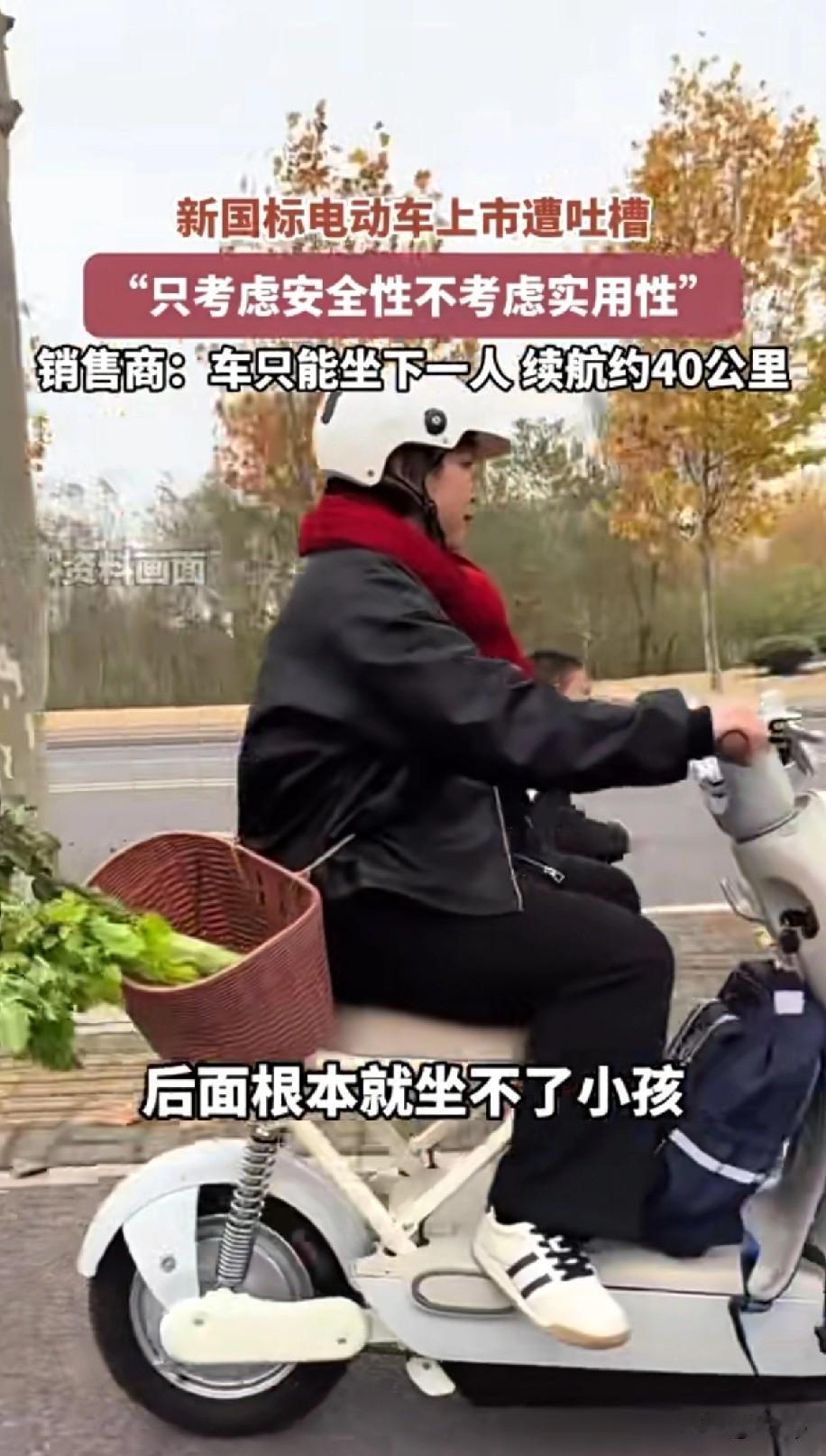 新国标电动车遭吐槽 这位女士是这么说的 光考虑安全性能没考虑实用性能 对于二胎的家庭特别不友好,后面根本带不了小孩,续航能力呢40公里 一些专家没事整天建议,整天研究电动车怎么治理,出发点是好的,但也得综合考虑全方面,一些不成熟的建议一旦采纳就会带来很多不合理 其实来说电动车还是安全放在第一位 但是安全性能再好,也架不住那些逆行 闯红灯不守交规的一类人 ,毕竟现在我们这边小电驴保守估计已经4亿辆了