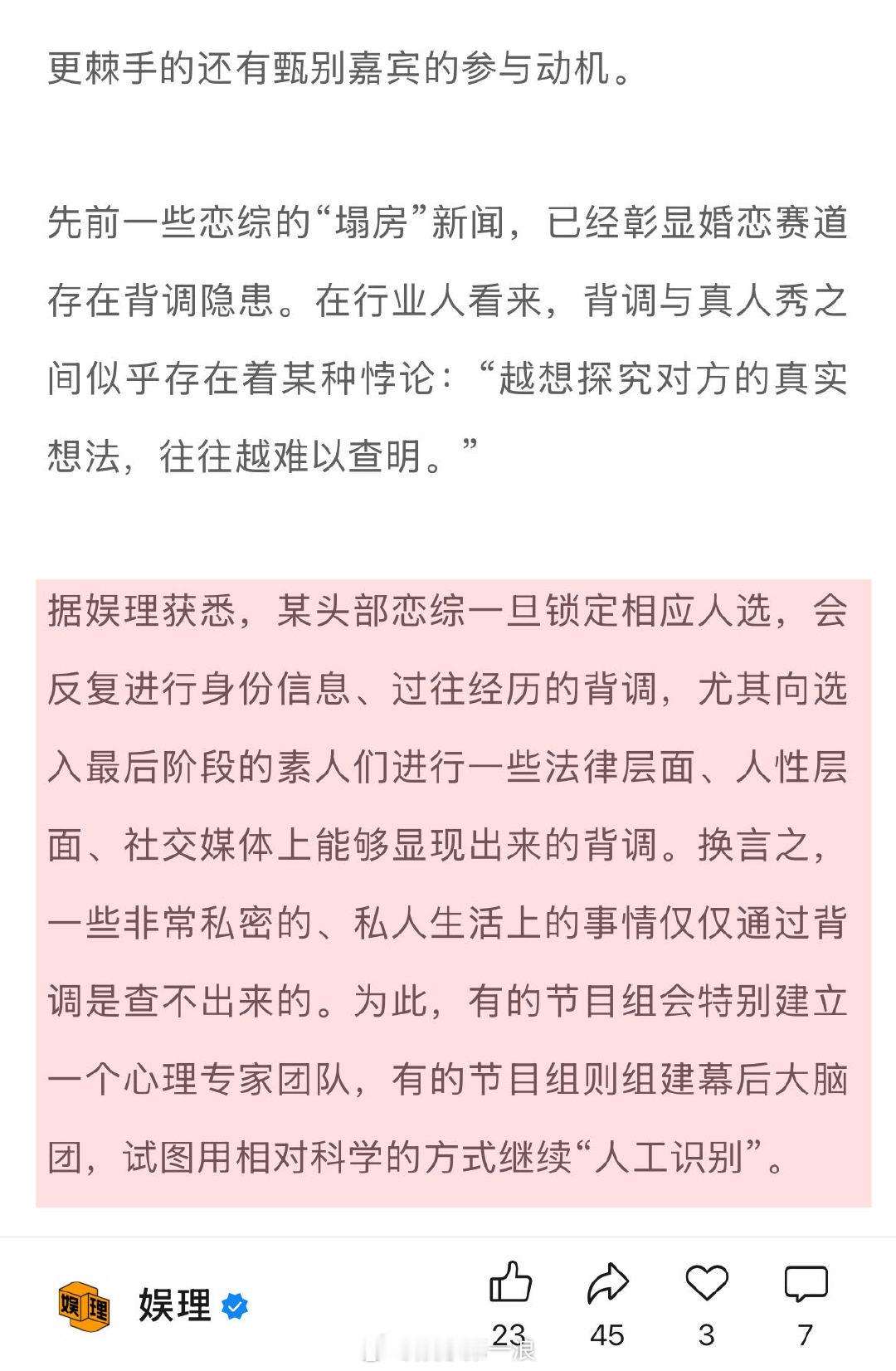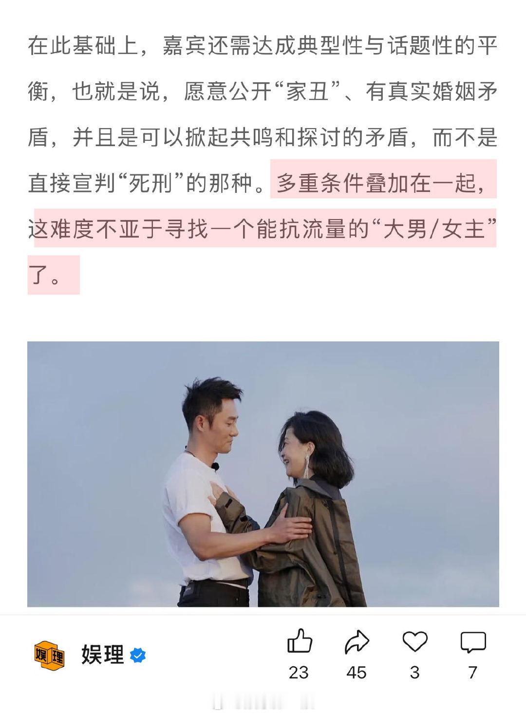 品牌方觉得离婚这事儿晦气 业内谈离婚综艺招商难 《再见爱人》的核心魅力在于“真实”,但这份真实恰恰是最难掌控的变量。如果要复刻这一题材,首先要过的就是“选角关”。以《再见爱人》为例,五季选角皆在“素人与名人”之间找到平衡,能做到这一点并不容易。名人受制于“家丑不可外扬”,要平衡和考虑的因素太多;纯素人,又有多少人会在意他们的感情生活?多重条件叠加在一起,这难度不亚于寻找一个能扛流量的“大男/女主”…娱理独家↓