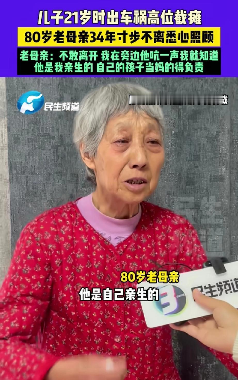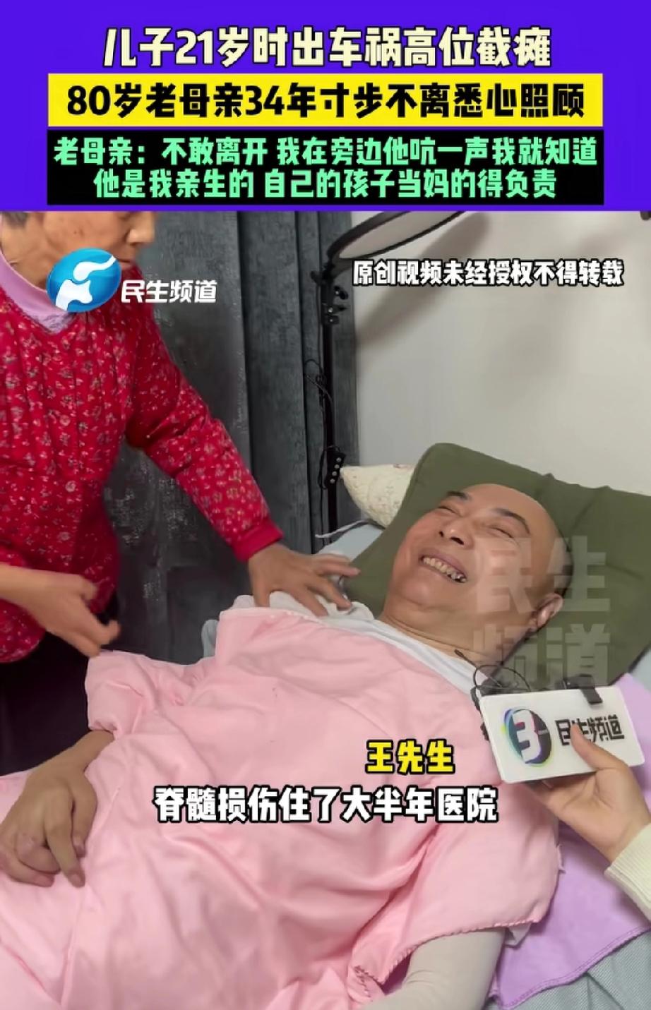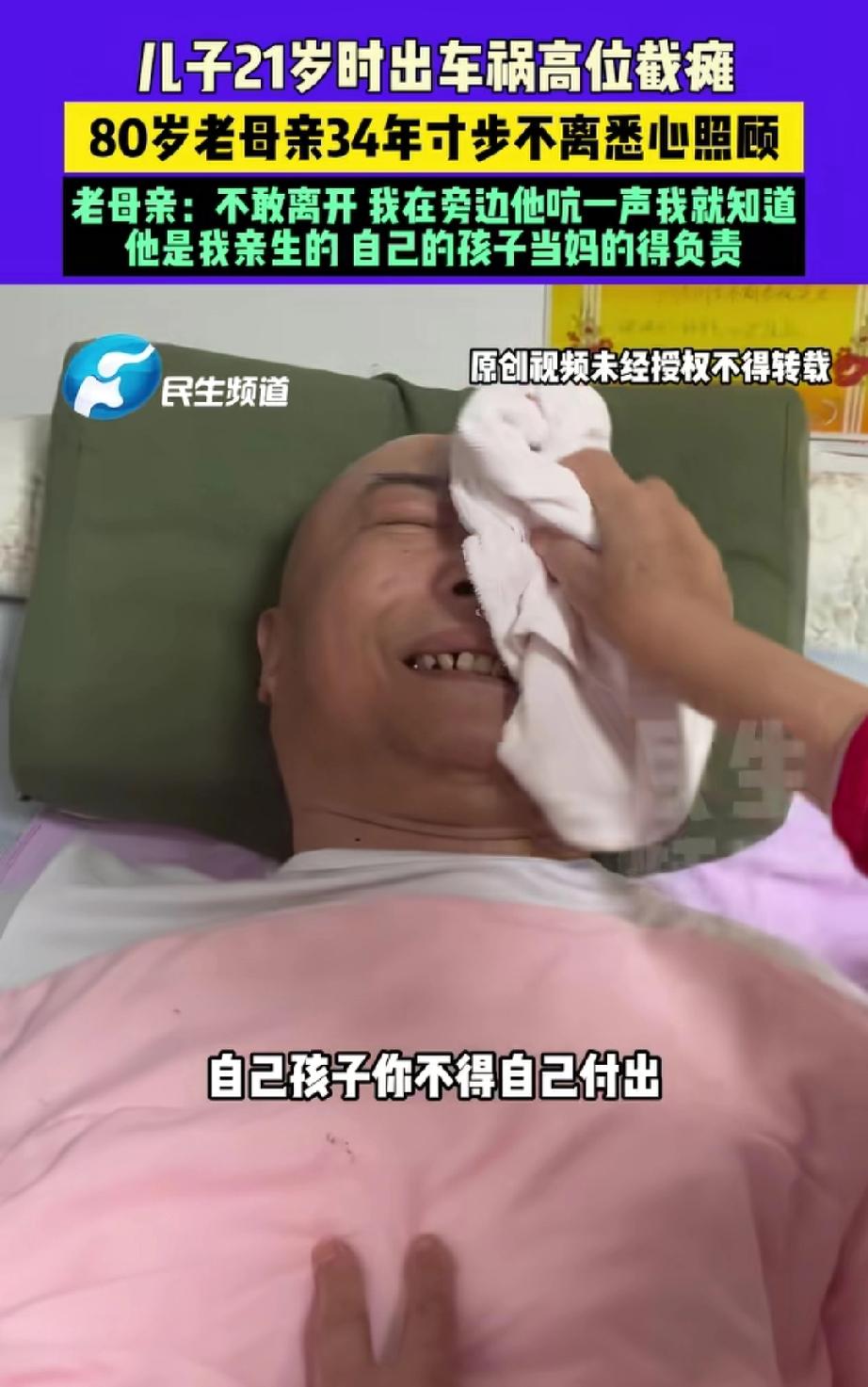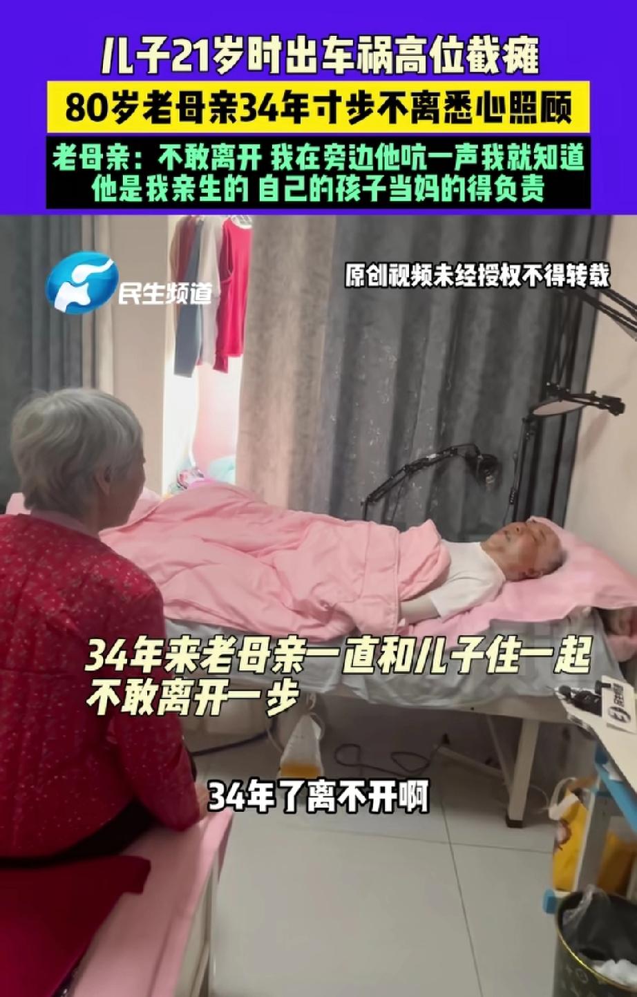 郑州,一位80岁的母亲悉心照料高位截瘫的儿子长达34年。每日,她为儿子洗漱、翻身