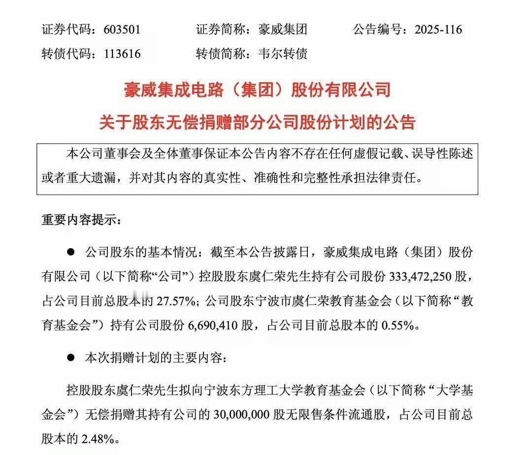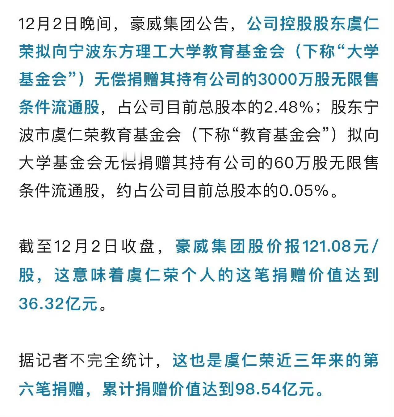 36亿宁波东方理工大学再获捐赠 36亿💰宁波东方理工大学再获捐赠‼️又是他🤩哇塞“芯片首富”虞仁荣又捐赠了‼️据豪威集团公告显示控股股东虞仁荣拟再次向宁波东方理工大学捐赠股份3000万股按12月2日股价计算这笔捐赠价值近36.32亿元💰这已经是虞仁荣近三年来第六次大手笔捐赠了累计捐了快100亿宁波东方理工大学本就是他发起捐资创办的创新型大学🏫总投资460亿从创校到现在持续输血真的太有社会责任感了不愧是宁波骄傲👍浙商骄傲👍同城热点创作计划