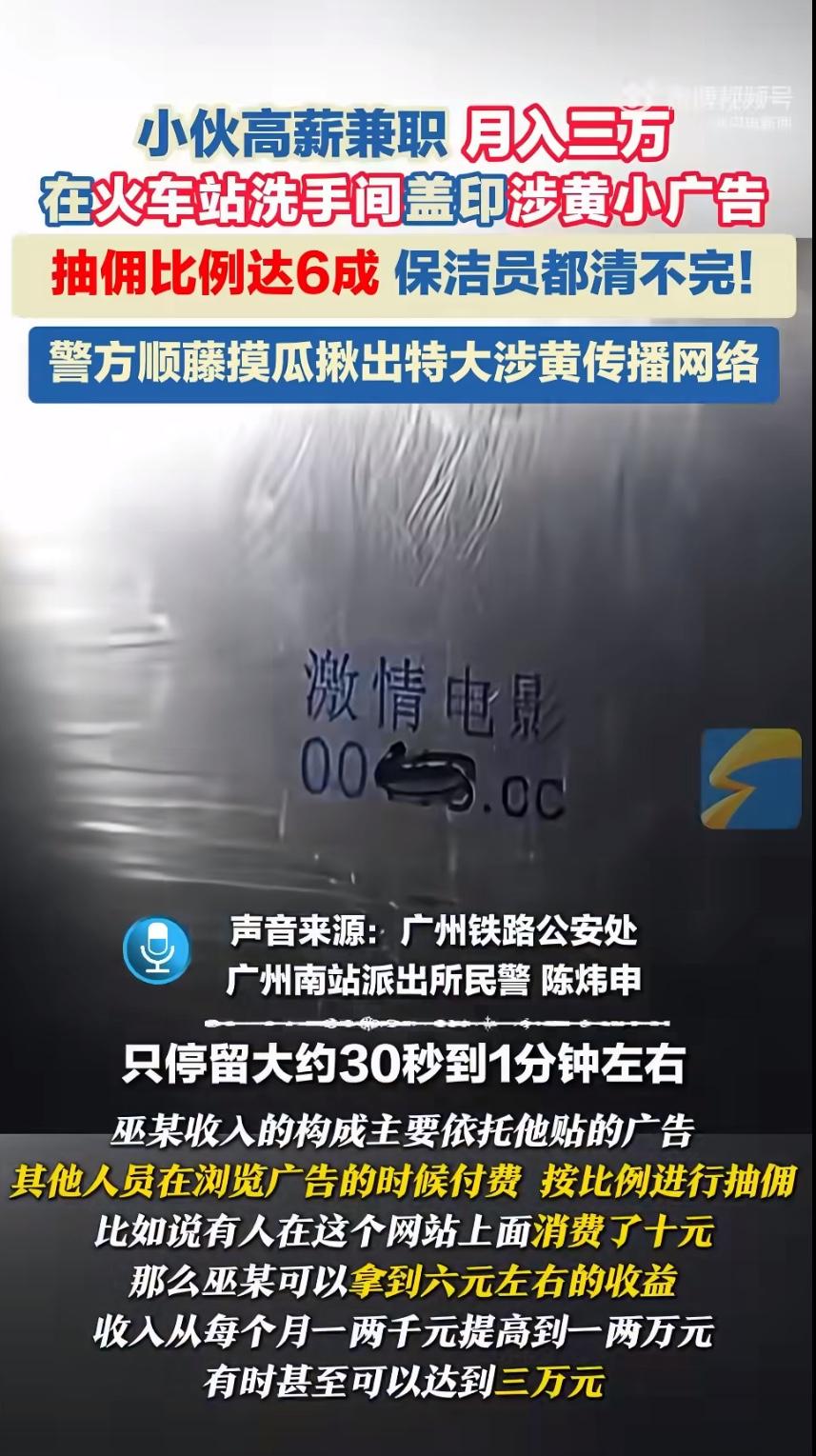 你敢相信吗?一个在厕所里只待30秒的男人,竟然牵出了一张横跨全国、涉及47人的特大涉黄网络。这事儿听起来像侦探小说,但就发生在我们身边,主角不是别人,正是广州南站的一名“盖章”小哥。 事情的起因特别有意思。车站的保洁阿姨发现,男厕所隔间的门板上,总有一些清理不完的涉黄小广告。她今天刚擦干净,明天又冒出来,有时候一天能出现好几次。这反常的现象,引起了警方的注意。他们调取监控一看,好家伙,一个没买票的男子,一天之内频繁进出多个厕所,每次只待30秒到1分钟,出来时还不冲水。这行为,简直比上厕所“打卡”还准时。 警方顺藤摸瓜,当场抓获了正在“盖章”的巫某,并从他包里搜出了印有涉黄网址的印章、印油和工具。巫某交代,他是看到了QQ群里的“高薪兼职”广告,才入了这个坑。最开始,他在公交站、人行道上盖章,但收益不好。后来,他把目标转向了人流量巨大的高铁站,收入也从每月一两千元,飙升到了一两万元,最高时甚至达到三万元。 你以为巫某就是幕后大佬?太天真了。他只是整个犯罪链条的最底层,负责线下“地推”。他的报酬,是由一伙以黄某为首的人员通过微信扫码结算的。而黄某等人,也只是负责支付和佣金分配,他们的上线,藏得更深。警方继续深挖,发现这些支付人员是通过暗网平台接任务,为推广者支付费用并抽佣。再往上,还有负责搭建网站的技术人员,他们甚至帮境外团伙架设服务器,上传淫秽内容。 这个团伙的分工,那叫一个明确。有人负责技术开发,有人负责线下推广,有人负责资金结算,形成了一个从“建站运维—推广引流—资金结算”的完整黑色产业链。他们利用境外技术内核,租用服务器架设网站,通过在火车站等公共场所盖印二维码,利用巨大的客流量引流,再通过非法手段转移资金,涉案金额高达3200万元。 这事儿最让人后怕的,是它的隐蔽性和危害性。小小的印章,短短的30秒,看似微不足道,却像病毒一样,污染着网络环境,尤其对未成年人的危害极大。试想一下,一个好奇心重的孩子,扫描了这些二维码,接触到那些不堪入目的内容,会对他的身心造成多大的伤害?这不仅仅是道德问题,更是法律问题,是社会问题。 这起案件的侦破,给所有人提了个醒。网络不是法外之地,任何企图利用网络进行违法犯罪的行为,终究会露出马脚。无论是保洁阿姨的细心,还是警方的敏锐,都告诉我们,维护社会秩序和网络环境的清朗,需要每个人的参与。同时,这也警示我们,面对那些看似诱人的“高薪兼职”,一定要擦亮眼睛,别被利益蒙蔽了心智,最终走上违法犯罪的道路。 现在,这个涉黄网络虽然被捣毁了,但类似的隐患可能还存在。你觉得,我们还能做些什么,来防止这类事情再次发生?如果你是那位保洁阿姨,你会怎么处理这些小广告?或者,如果你发现了类似的可疑行为,会怎么做?欢迎在评论区聊聊你的想法,让我们一起为营造一个更安全、更健康的网络环境出份力。 (案例来源:闪电新闻)